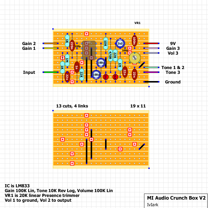 Már zenész ismerősök is kérték, úgyhogy fogok készíteni. Közben összeraktam egy Crunch Box-ot, de nincs LM833 IC-m, most megteszi az RC4558P is. Próbáltam az LM358-cal, de a 4558-nak jobb a mély hangszíne - legalább működik és jól! Ennek nagyon örülök, mert a korábbi IC-s próbálkozásaim befulladtak. Nevezetesen ami LM386N-nel készültek, az nekem nem működött soha megfelelően, vagy egyáltalán nem...