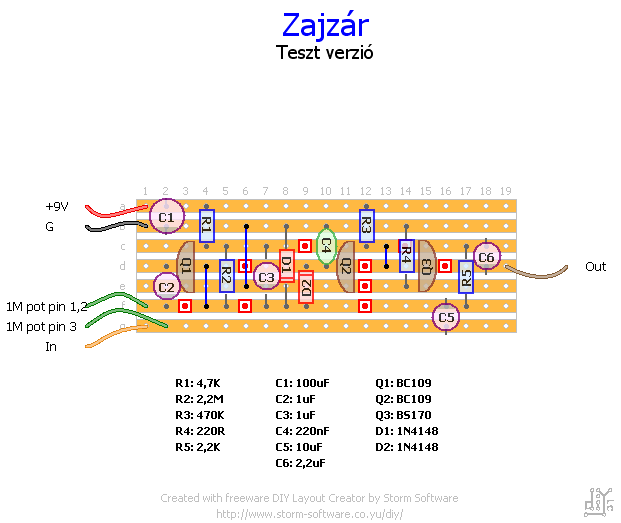 Találtam ezt a zajzárat és most rajzoltam hozzá egy elrendezést. A kérdés csak az, hogy fog-e működni? Mert BC108- ak vannak, 2N3904, meg 2N5088, BC182L is, csak annak el kell tekernem a lábát. Vannak más BC szériás tranyóim, de többsége PNP...