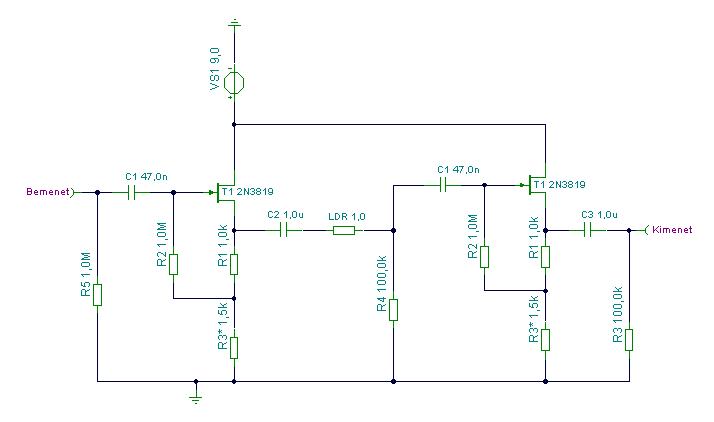 . Pedálban gondolkodva kell egy be- és kimeneti buffer (én jfetet alkalmaznék ide, de jó a műveleti erősítő is), közé pedig egy feszültség osztóba befoglalva az LDR ellenállása, méghozzá úgy, hogy a "felső" legyen az LDR. Az alsó ellenállás lehet 100k körül. Rajzolok egy ilyen rajzot neked. Csak, mint ötlet, ezt tovább lehet gondolni bátran, akár erősítést is lehet adni a körnek...Én a mellékelt ábra alapján csinálnám, R3 -al kellene a source-ön beállítani tápfesz felét kb a többi maradhat annyi ,amennyi a rajzon van. Érdemes betrimmerezni ,aztán közeli szabvány ellenállással helyettesíteni a beállítás végén. Persze megoldható műveleti erősítővel is, akkor két "feszültség követő" közé kell bekötni ez alapján a filozófia alapján, de ez a jfetes megoldás jóval muzikálisabb az én fülemnek...Ennyi ötletem lenne! :integet2: