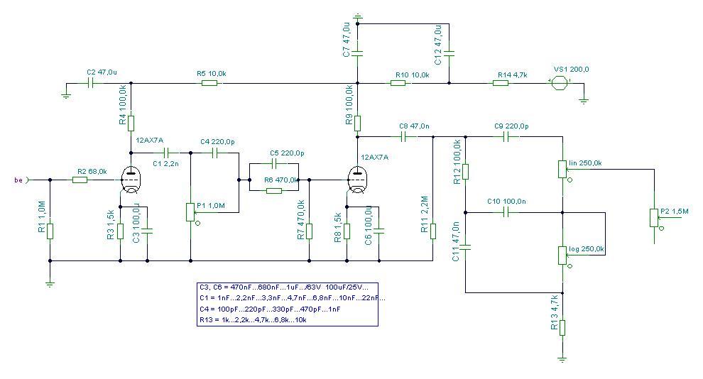 Első lépésben fontos a tápban az a pár RC létra. Érdemes lenne a végfokon annyit elkövetni, hogy a puffer elkót kicserélni. Erre zseniálisan megfelel egy bontott pc táp puffer pl. Nem baj, ha nagyobb is lesz kapacitásban, persze érdemes az egyenirányító hídnak is utána nézni, hogy bírja -e, ha kétséges, akkor filléres 4007-es dióda, vagy ami a pc tápban van pl...de venni is lehet nagyon jó EPCOS kondikat a lomexben pl, azok sem túl drágák. A pufferről lehetne táplálni azt az RC létrát, amit kb vízionáltam a rajzon, ezen esni fog azért pár 10V feszültség, de muszáj, hogy sima tápfeszünk legyen. Az első triódára így kb (fokozatonkánt kb 1mA munkaponti árammal számolva) olyan 150-160V jut majd a 200V -ból ,ami nem éppen sok ,de szólni fog (az anód és katód értékek nem éppen teljesen tudományos értékek, de menni fog, jó lesz...)! A tápban az elkók természetesen szintén nagyfesz kondik legyenek. A katódokban 100µF-ot jelöltem, ez a teljes frekencia sávban rányomja a max erősítést. Amennyiben elkezded csökkenteni, úgy a mély hangok erősítése csökkenni fog, kvázi úgy fogod érezni, hogy közép- magas emelésed lesz. Minél kisebb van ott, annál inkább magas emelésed lesz. Teszem én azt egy 470nF már inkább csak a magasban emel, míg egy 1-2µF már a közepekben is jóval érezhetőbben. Javaslom azt, hogy először nagyot tegyél oda. Ezután jön C1/P1 csatoló komplexum, majd ezután egy 470k/470k osztó, átblokkolva 220pF el. Némi osztás azért nem árt, de az is lehet, hogy nem kell, ha a tervben benn van, kivenni mindig egyszerűbb és rövidre zárni, mint kínlódni, ha nincs helye rendesen... A 220pF azért kell, mert így nem lép fel az osztón magas veszteség, amit a trióda bemeneti kapacitása okoz (terheli R7-et, párhuzamba kapcsolódik vele, így egy alul áteresztőt alkot, értéke jellemzően 60-70x -es fokozat erősítéssel számolva 100-150pF (Miller kapacitás), ehhez jönnek még szerelési és szórt kapacitások...), így egy kompenzált osztó jön létre és nem vész el a magas! (persze lehet növelni az értékét, pl 470pF és akkor már magas "emelésünk" is lesz, korrektebben fogalmazva, azt nem osztjuk annyira...) Egy ekkora osztást azért beterveznék, nem kell ítélet gén....A C1-el kezdeném a kísérletezést, ami a P1 ellenállásával alkot egy felül áteresztőt, 2,2nF -al ez a -3dB -es pontot 70-80Hz körülire teszi, kb a normál hangolt mély E húr frekvenciája körül. Ha vékonynak tűnik a hang, akkor lehet növelni, 22nF már bőven a teteje szerintem a kísérletezésnek. Egyet meg kell érteni, ha torzítást szeretnénk, a hangon vékonyítani kell ,mert blokkolási torzítás jön elő, ami jellemzően ilyen zizi ami meglovagolja az eredeti hangot, egy ilyen ronda recsegés, kísérletező kedvűek találkozhattak már a jelenséggel....A vékonyítást pedig vagy itt, vagy a katódban vagy ezek tetszőleges kombinációjával persze. Elképzelhető első fokozatban egy 100µF katód bypass, egy 4,7nF kicsatoló meg egy 1µF második katód bypass...csak úgy a hasamra csaptam, de érdemes valami logikát vinni a kísérletezésbe. Csatlóknak érdemes 630V-ost betenni, persze kisebb is jó, de nagyfeszültségűben gyakori a 630V os, pl a régi remix stirók. MKP, MKT, FKP ,ezeket érdemes csatolónak bepróbálni, nagyon jók a wima kondik is ezekből. A P1-en található 220pF ugyanazt a hatást csinálja, mint ami az osztón van, minél nagyobb a kondi, annál markánsabb a magas emelés, ha lejjebb tekerjük a potit, kisebb génre. Ez egy ilyen gain poti állástól függő magas emelést eredményez. n x 1nF érték esetén már a közepet is..azt azért nem ajánlanám. Itt is ugyanaz történik, a magas hangok inkább a kondin át szeretnének menni, nekik az kisebb ellenállás, míg a közepek, mélyek osztást szenvednek a potin... C8/R11 az említett kicsatoló komplexum, ha nincs C9-ből nagyfeszültségű. Természetesen C8 nagyfeszültségű legyen. A hangszínkörben már 63V -os szintén MKP, MKT, FKP kondik lehetnek, MKS-t amennyire lehet, inkább ne. Csak pár alkatrészről van szó, szerintem érdemes megadni a módját...R13 helyettesíti ebben a Fender -féle hangszínben a közép potit, ez kb egy közép állású közép potinak felel meg, ha kevesebb közép kéne, akkor csökkenteni kell ,ha több ,akkor növelni, kb 10k lenne a maximum. A "felső" lineáris poti lenne a magas, az "alsó" meg a mély. A magas csúszkára jöhetne a meglévő 1,5M hangerő poti. kezdésnek mindenképpen olyan konfigurációt néznék, ami mentes mindenféle durva emeléstől, vágástól (mint kb az ábra, csak C1 lehetne 22nF). Első lépésben megkeresném milyen C1 érték felel meg mind tisztán (nem vékony nagyon) mind torzon (nem is recseg rondán). Ezután meg lehet nézni C4 értékét; akarom-e ,hogy markánsabban szabályozzon közép- magasban vagy sem (kb annyit jelent ez, hogy egy közepes gain poti állásban tesztelve kell-e nekem több magas vagy éppen jó, ami a gén növelésével persze csökkenni fog). Ezután jöhetnek a katódok kísérletei, ha nagyon elvékonyodna érdemes C1-et utána hangolni, növelni. Hangszínben meg a közép potit helyettesítő ellenállással játszani, de szélsőségesen lecsökkenteni nem érdemes, mert elveszti a súlyát a hang, nem szabad a közepet herélni! És kb kész. Ezért jók az ilyen egyszerű topológiák, sokat lehet velük tanulni, meg egyszerű módosítani őket! Jó munkát vele, a kivitelezésre is van pár tippem, hogy ne legyenek "anomáliák", ha érdekel persze pár szóban...Zs.