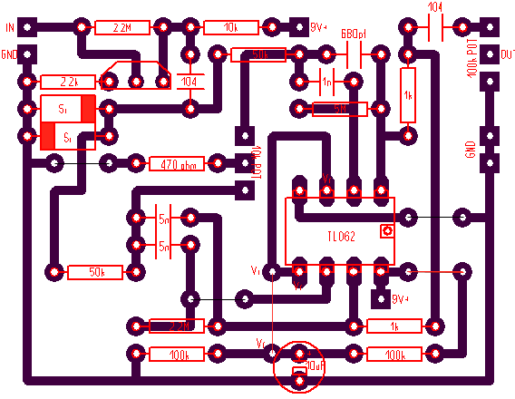 Amíg nem készül el egy pedál, addig nem érdemes Clean csatiról beszélni, úgy értem amíg nem szól direktbe kötve addig sosem rakok bele kapcsolót!!! (Mert ha véletlenségből ott kötsz el valamit, akkor hiába keresed a panelon a hibát..., mert a kapcsolóig megy a hang, de tovább nem.) Eléggé áttekinthetőnek tűnik pedál, nagyon örülnénk 1-2 fotónak, ha megoldható! És talán abból többet látunk. A C7 meg az R7 (vagyis minden) azért csak legyen a helyén... C5 tényleg nincs, sőt azt is mondhatnám, hogy ott a dióda körül egész más a rajz. Lábakat-forrasztásokat leellenőrizted "sípolós" műszerrel, hogy átadnak-e? Mert néha előfordulhat, hogy látszólag be van forrasztva a láb, de mégsem érintkezik.Illetve itt egy régebbi hozzászólásom arról, miként keressük a panelon a hang útját a Bemenettől a Kimenetig!