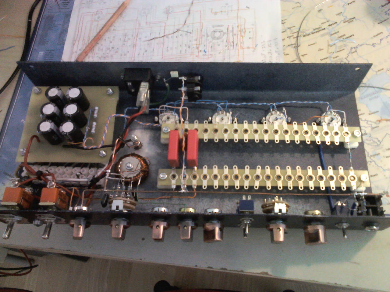 ECC82 és ECC83 csővel volt tervezve az előfok, de nagyon sok volt az erősítésük. Most 6N1P és ECC 85 van benne. A ferrit tekercs nem lett a legszebb, de működik. Még a bass selektort kell bekötni. Egyébként ez egy Ampeg SVT előfok, némi módosítással. Nem zúg, nem gerjed, nagyon szép hangja van.