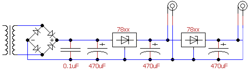 Nyilván ez is egy jó megoldás lenne, de én mégis inkább egy központit szeretnék. Nem ragaszkodom a soktrafós megoldáshoz, de az jó lenne, ha a szeparált kimeneteket meg tudnám oldani. Találtam egy ilyen kapcsolást. Ez nem lenne megoldás? Trafóm van itthon jópár, találnék egy megfelelőt.