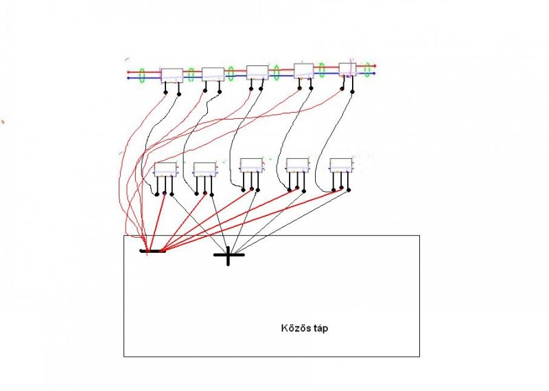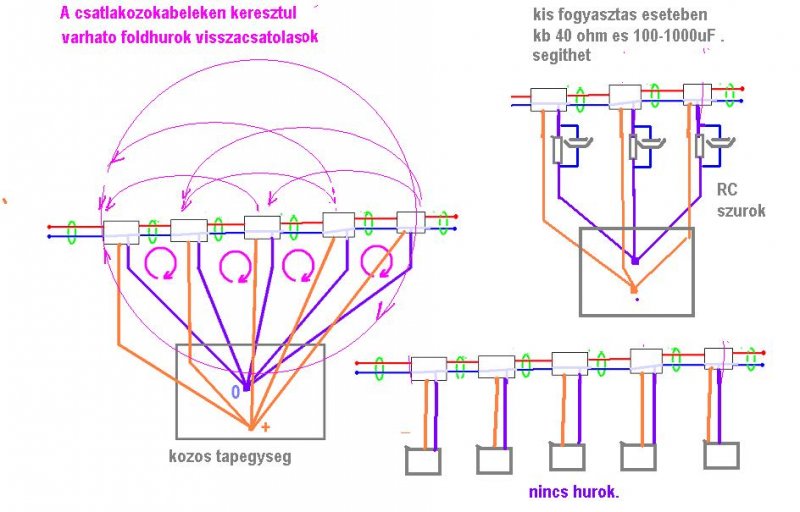 Hogy mikor alakul ki a foldhurok az veletlen kerdese a pedalok kabelezese eseteben a visszacsatolashoz bizonyos korulmeyek kellenek ( impedancia, fazis,erosites...stb ) Ha oszcilatoprt akarsz epiteni nem rezeg , ha meg erositot biztros oszcillatorkent jobban mukodne...hehe. Ide rajzolgattam hogy lassad menyi eselye van a visszacsatolasnak egy soros pedalkosszekapcsolasnak is. Az az ellenallasos megoldas ( szures/hidegites) kis fogyasztasnal mukodik de nagyobb nem valtozo fogyasztasnal is csak hogy akkor ki kell probalni melyik a minimalis ellenallas es egy nagyobb kondival mikor tunik el a visszacsatolas altal okozott zaj/oszcilacio stb..es az ellenallason ne essen tul sok feszultseg. En kulon stabikat tettem amiknek kulon szures van elotte utanna igy valamenyire az is segit foleg magasabb ferkvenciaju impulzus / orajelek kiszuresenel amik tulloveseinek magas harmonikusai a pozitiv tapagon is terjednek . De ha kozos a fold/arnyekolas sorba kotott pedaloknal fellephet a visszacsatolas a foldhurkon keresztul a melyebb tartomanyokba hiaba van a pozitiv ag szurve..