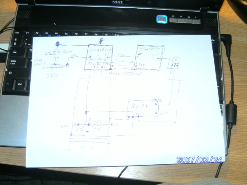 A GND-t egyáltalán ne kösd rá a dobozra, csak a hálózati védőnullát. A bemeneti R-C tagot vedd ki, mert nem kell bele ilyesmi. A rajzon úgy látom hogy a hangszín, az overdrive panelról kapja a GND-t. Ez sem jó. Kösd azt is a pufferek GND-jére, a csillagpontba. A jack aljzat GND-jét ne a csillagpontba kösd, hanem az overdrive panel bemeneti GND-jére. Ha a gitárodnak is földelési gondjai vannak, akkor csinálj hozzá egy kábelt, szimmetrikus mikrofonkábelből, aminek csak az egyik végén forrasztod rá az árnyékolást az egyik belső vezetékre és ez a fele megy az erősítőbe. A másik végén nem forrasztod rá semelyikre az árnyékolást és a két belső vezeték megy a gitár felőli jack dugóra. Ez hatásos, csupán annyi a hátránya hogy nem mindegy, melyik felét hová dugod.