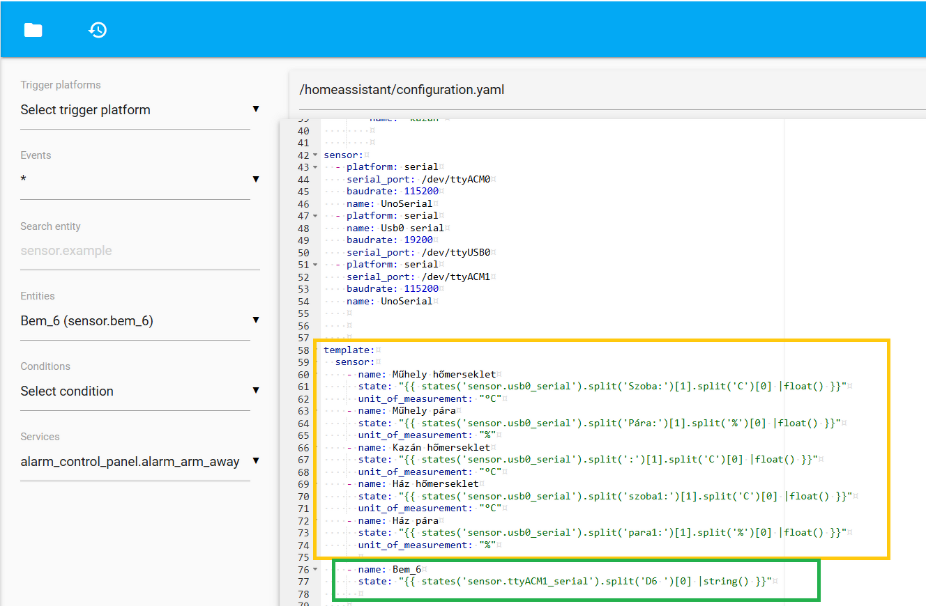 home assistant programozásÜdv!Van itt valaki aki ért a Home Assistant programozásáshoz? Volna egy szerintem egyszerű kérdésem, csak mivel én nem tudok programozni nem nagyon jövök rá a problémára, szóval nem kinevetni. ![]() A Home Assistant egy RPI-n fut, ahhoz csatlakoztatva van egy (illetve több de az most mindegy) Arduino Uno mint külső bemeneti modul. Amikor a uno valamelyik digitális bemenete szintet vált akkor beküld egy csomagot, a következőképpen. Ha pl. a D6 alacsony szintű lesz akkor bejön egy csomag ami így néz ki: D6 0 ezt soremelés kocsivissza zárja le (arduino oldalról serial.println-el van kiküldve ha minden igaz és karakterként). Ha a D5 lesz alacsony akkor értelemszerűen D5 0 jön be ha magas lesz akkor meg D5 1. Csak akkor jön csomag ha változás van amúgy kuss van a soros vonalon. Odáig eljutottam, hogy az Uno a ttyACM1 porton van, mellékelek pár képernyő képet. Az uno_serial_mukodik képen pirossal bekarikáztam ahol látom a változást, de mivel ez csak egy "soros monitor" itt mindig a legutolsó csomagot látom csak. A kod nevű képen a kódrészlet látszik. A narancssárgával bekarikázott rész működik, azt egy másik arduino küldi azt én csináltam (sok mintapélda alapján) már több mint egy éve, akkor is nagy küzdelemmel (az arduino kódot is, meg ami ide van írva azt is, most nem én írtam az arduino kódot és nem is szeretnék belenyúlni ha nem muszáj). A zölddel bekarikázottat kéne most elindítani, vagy ha szerintetek máshogy kéne azt is szívesen meghallgatom. Szóval azt szeretném, hogy az érzékelők között a lilával bekarikázott módon legyen ott az adott digitális bemenet állapota (úgy mint a többi sorban a többi adat), jelenleg azt írja ismeretlen. Értelemszerűen több ilyen sort fogok csinálni, minden bemenetnek külön külön, de ha valaki segít egyet megcsinálni a többit már szolgaian át tudom faragni. Előre is köszönöm! okosotthon EP32 velSzinte teljesen kész a rendszer.Ígértem a nézegetős logint. Természetesen a gobnyomások hatástalanok! login : teszt pass: teszt ESP32 home link A hozzászólás módosítva: Feb 20, 2025