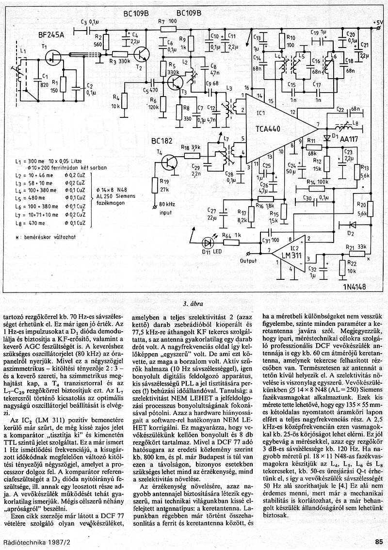 Nálam a TCA440 max. erősítés esetén néha begerjedt. Valószínű, ha az első fokozat után élesebb szűrő lenne, el lehetne kerülni. További gond, hogy a max. erősítés mellett már túl nagy a jel a PLL FSK demodulátor számára (200mV eff. szükséges az LM567 -nek. Digitális -mikrokontrolleres- demodulátorhoz pedig kevés.)
