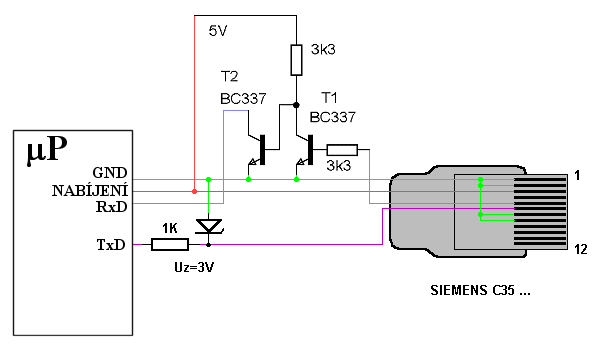 Tulajdonképpen a TxD vonalra szerintem is elég egy ellenállás ( kb. 1k). Az RxD vonalra pedig egy ellenállás osztó. De nem biztos, hogy minden telefonnál működik.