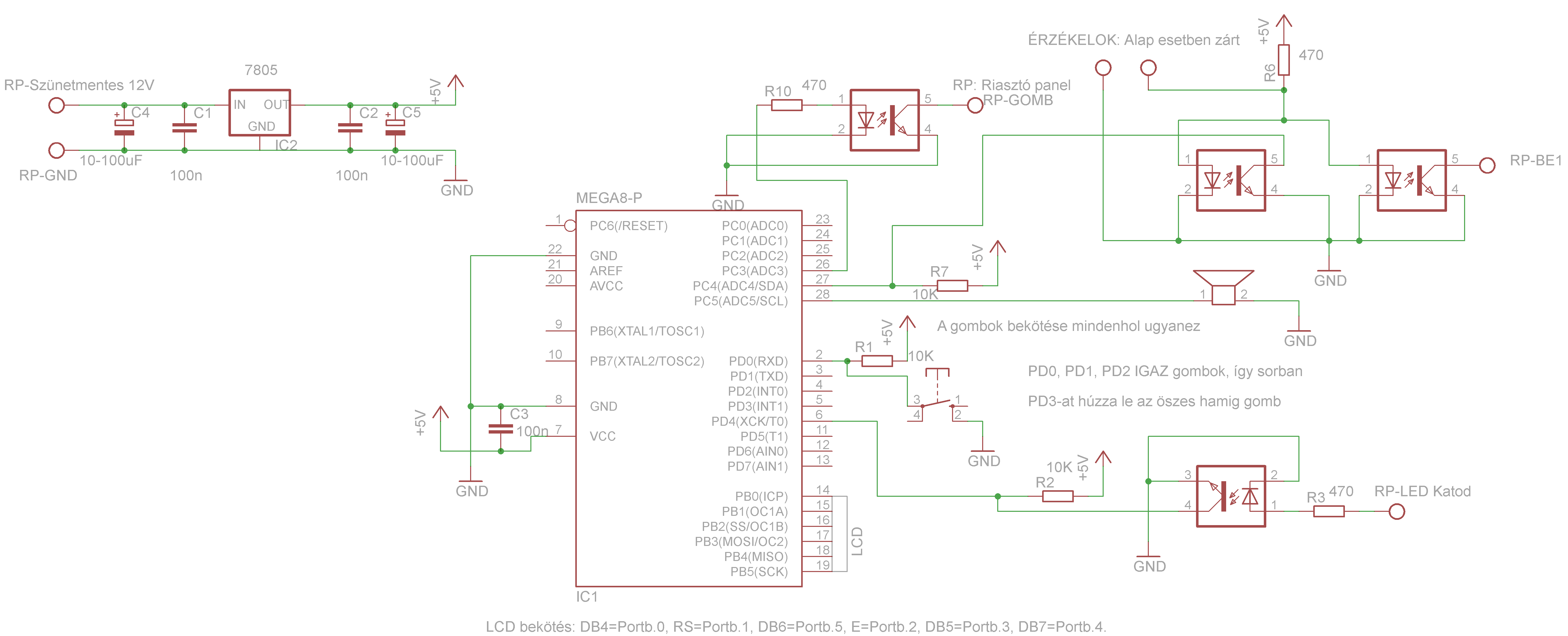 Előre mondom hogy inkább vázlat lett mintsem pontos kapcsolási rajz. Az LCD bekötését csak odaírtam, nem rajzoltam le, én 2*24-eset használok hozzá.