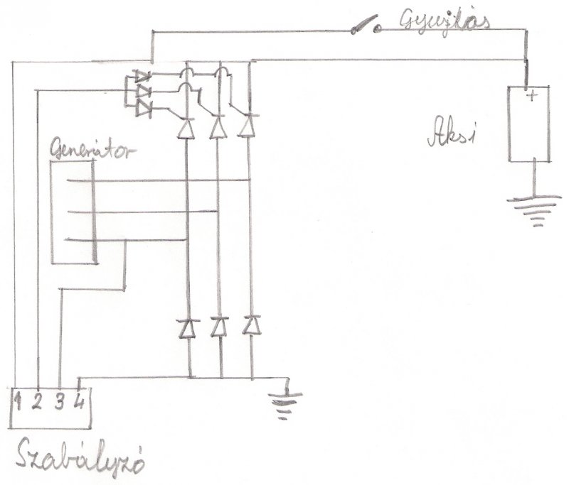 Szia láttam a rajzot és a 3 DR tirisztor ha nem kell a töltés testre kapcsolja a generátor 3 fázisát ezért kell hütteni a panelt (a zsiguli fesszabájzot miért nem hütjük)