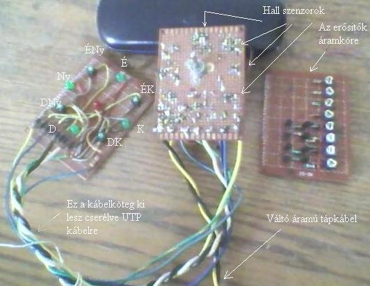 Itt egy fénykép a készülő szélirányjelzőhöz. A hall érzékelők egymástól 45 fokra találhatók. Elég elmosódott a kép, de kivehető a lényeg. A középső tengelyt egy képmagnóból szereltem ki, arra lesz rögzítve egy mágnesdarab. Eredetileg két tesztlapra akartam szerelni az összes elektronikát, de nagyon össze lett volna zsúfolva. Két lap fenn lesz az oszlopon, a kijelző benn a szobában. A tengely, aminek a segítségével a mágnes körbefordul, meg lesz hosszabbítva és azon lesz a szélkakas. Az esővédelem csak részletkérdés.