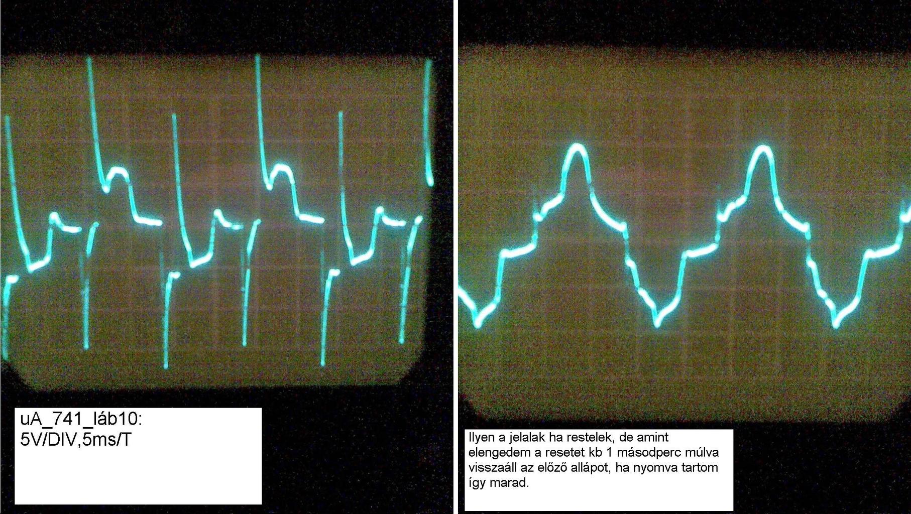 Raktam a 741-nek foglalatot, tirisztor visszakerült, saját tápról megy, az eredmény ugyanaz, új 741-gyel és a régivel egyaránt kéri a resetet.