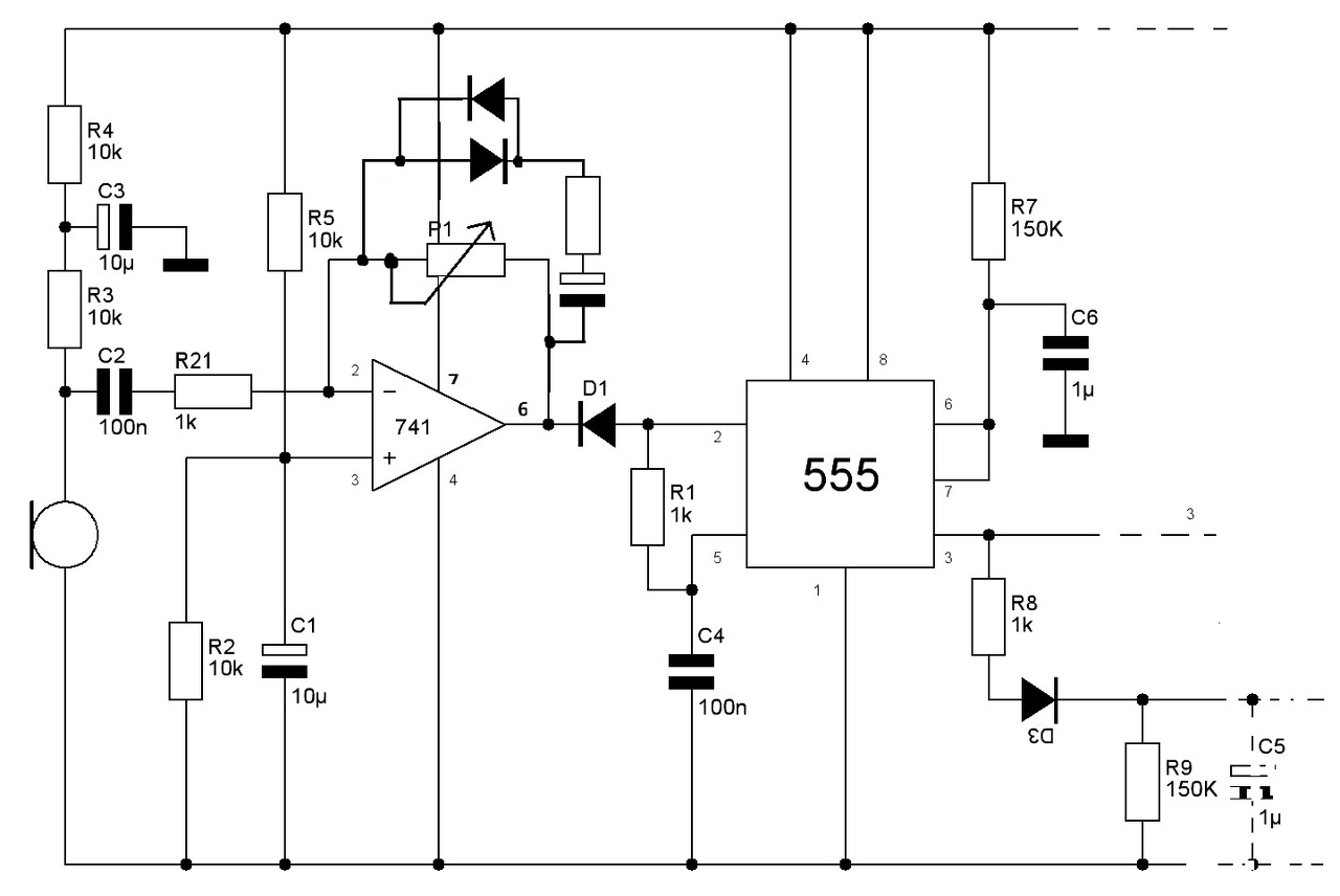 Nálad az a gond, hogy a 741-s kimenetén az alapszint a táp fele (2,5V). Azaz azt egy kondival le kell választani majd utánna a hangjelet csucsegyenirányitani a trigger számára, ha ott >2,5V hangjelet kapsz akkor már müködni fog a cucc.