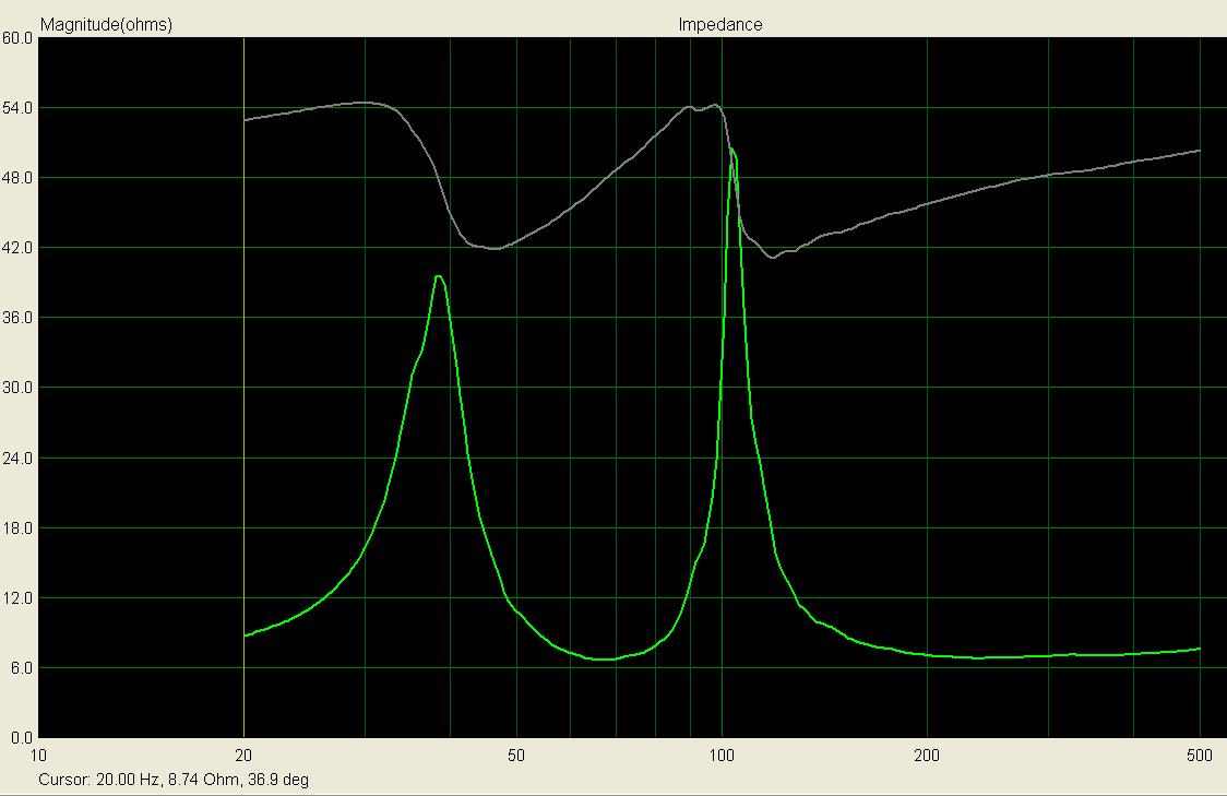 Íme: Fs = 55.56 Hz Re = 6.00 ohms[dc] Le = 1893.37 uH L2 = 12243.34 uH R2 = 0.99 ohms Qt = 0.48 Qes = 0.53 Qms = 5.40 Mms = 24.12 grams Rms = 1.559862 kg/s Cms = 0.000340 m/N Vas = 57.31 liters Sd= 346.36 cm^2 Bl = 9.796318 Tm ETA = 1.80 % Lp(2.83V/1m) = 95.90 dB Closed Box Method: Box volume = 36.00 liters Diameter= 21.00 cm