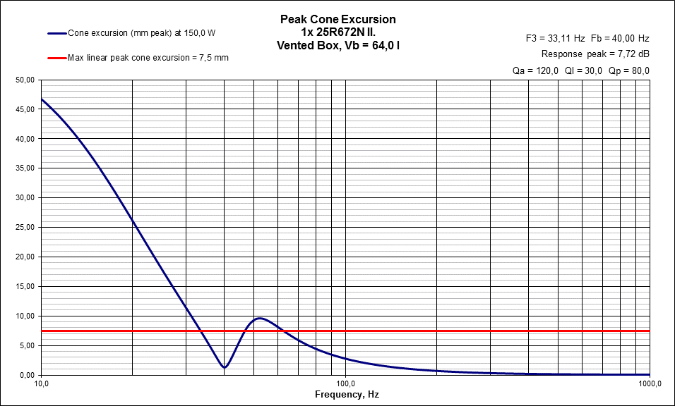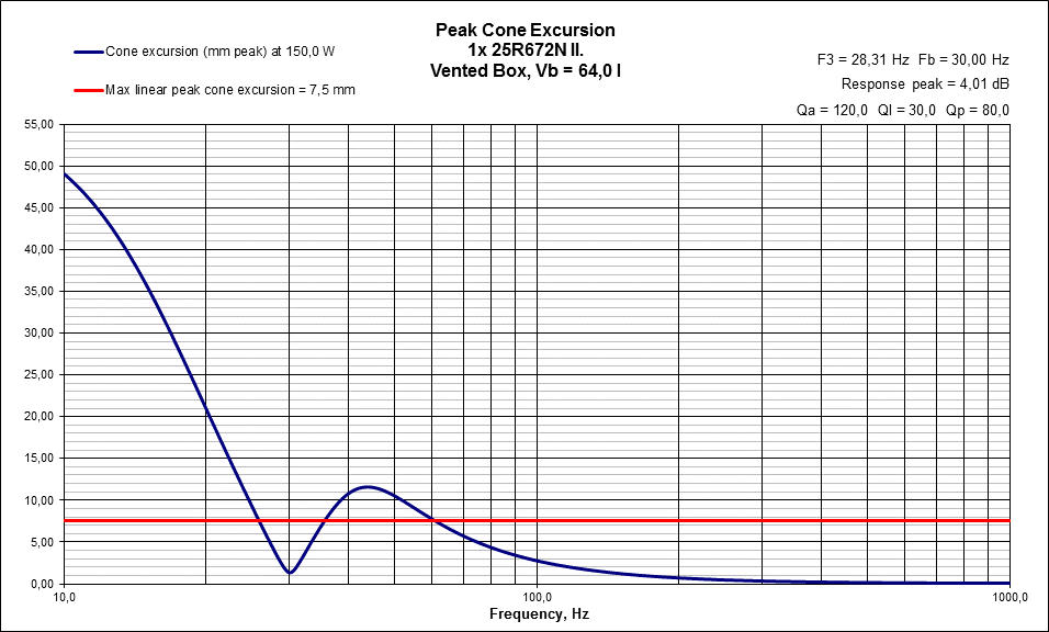 Hidd el nem lesz szükséged a 30 Hz-es hangolásra , ugyanis nem nagyon fogsz tudni különbséget tenni 28 és a 33 Hz F3 között, Viszont a hasznos teret pazarolod a hosszú nagy átmérőjű csövekkel. Azonkívül a terhelhetősége jelentősen csökken. Lásd csatolmány. Magyarán a 30 Hz es hangolással a lineáris kitérést (±7.5mm) jóval túlléped az ajánlott max kitérést a ±9mm is . Ez ±12 mm ami már közel áll az ütközéshez. A 40 Hz megfelel az adatlap elvárásainak.