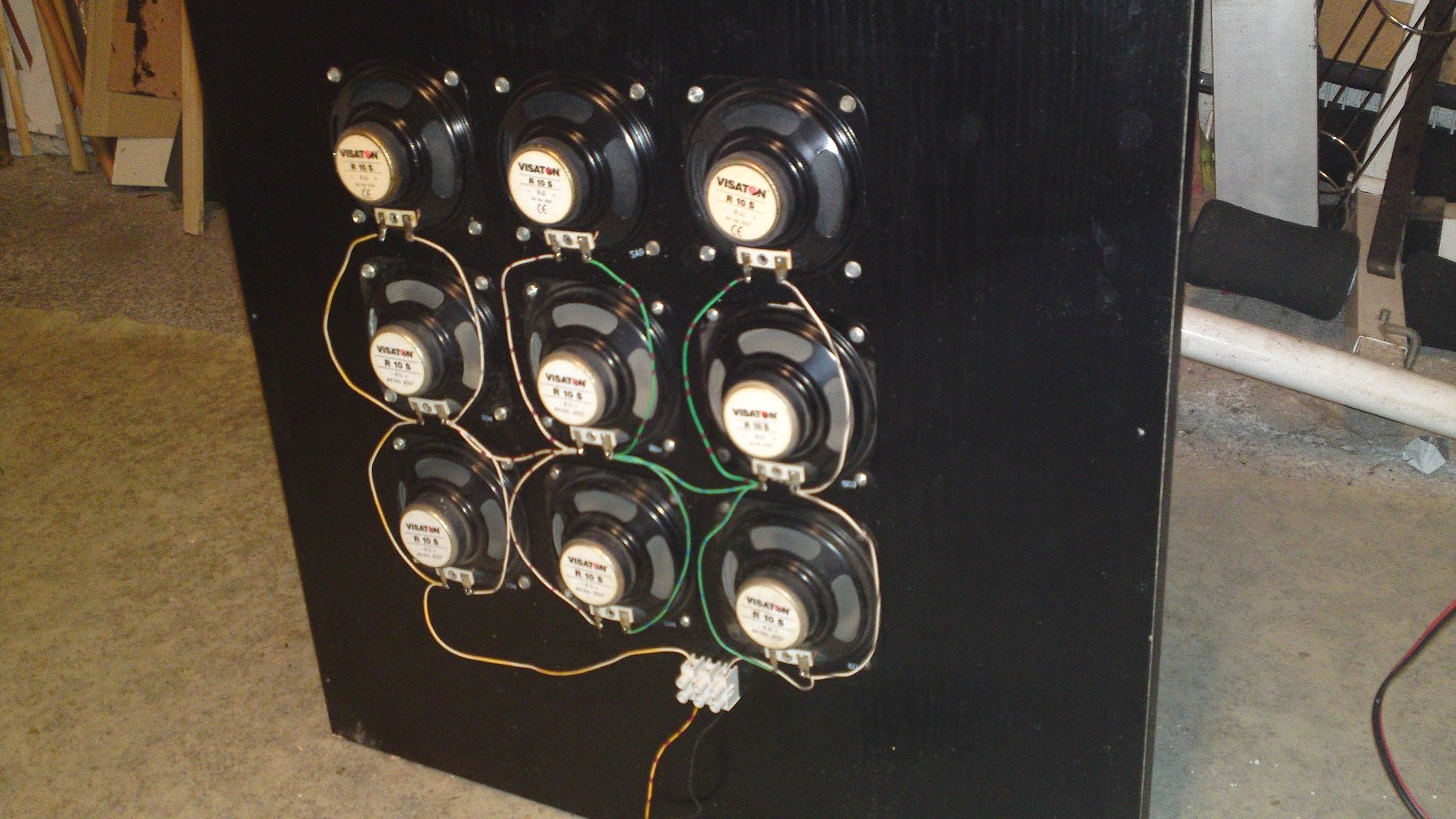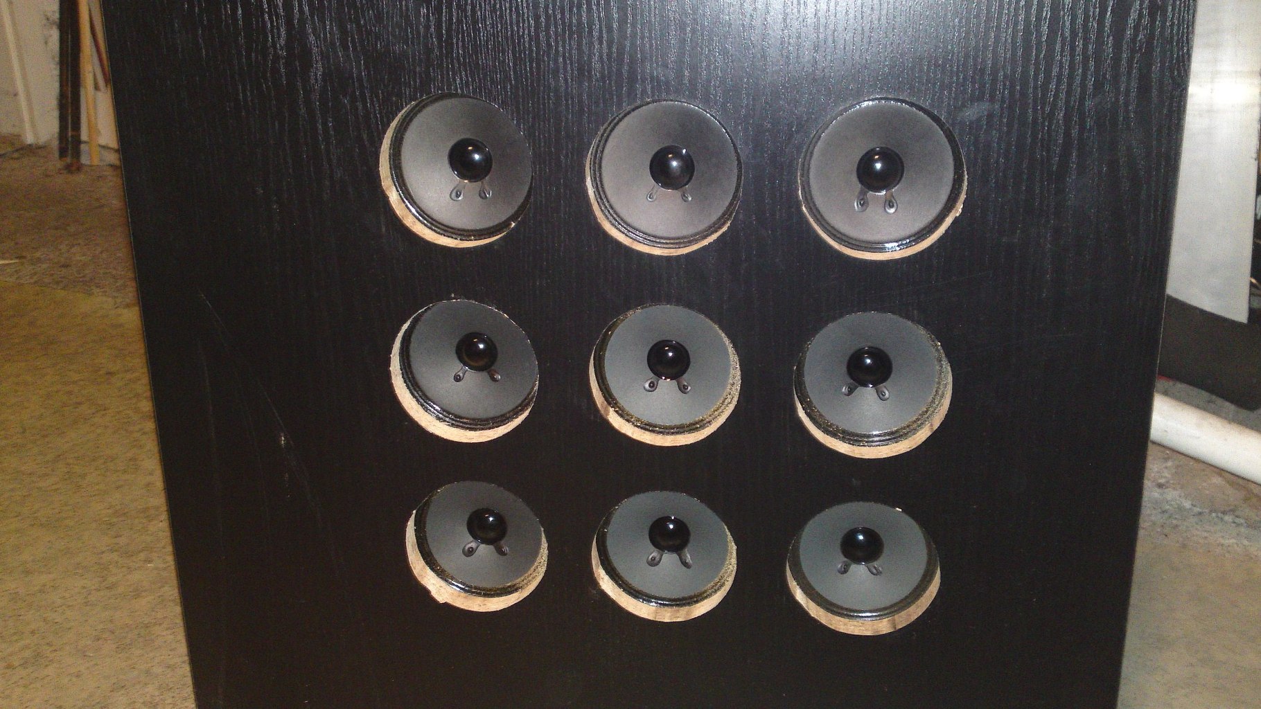 Sziasztok! Itt egy prototípus. Még lesz rajta pár változtatás, egy biztos 9 db Visaton lesz egy lapon. Valószínűleg egy függőleges vonalba fogom rendezni őket. A kísérlet másik tanulsága: a furat mögé szerelt hangszóró előtt létrejövő cső (tölcsér?) kellemetlen kiemelés okoz.