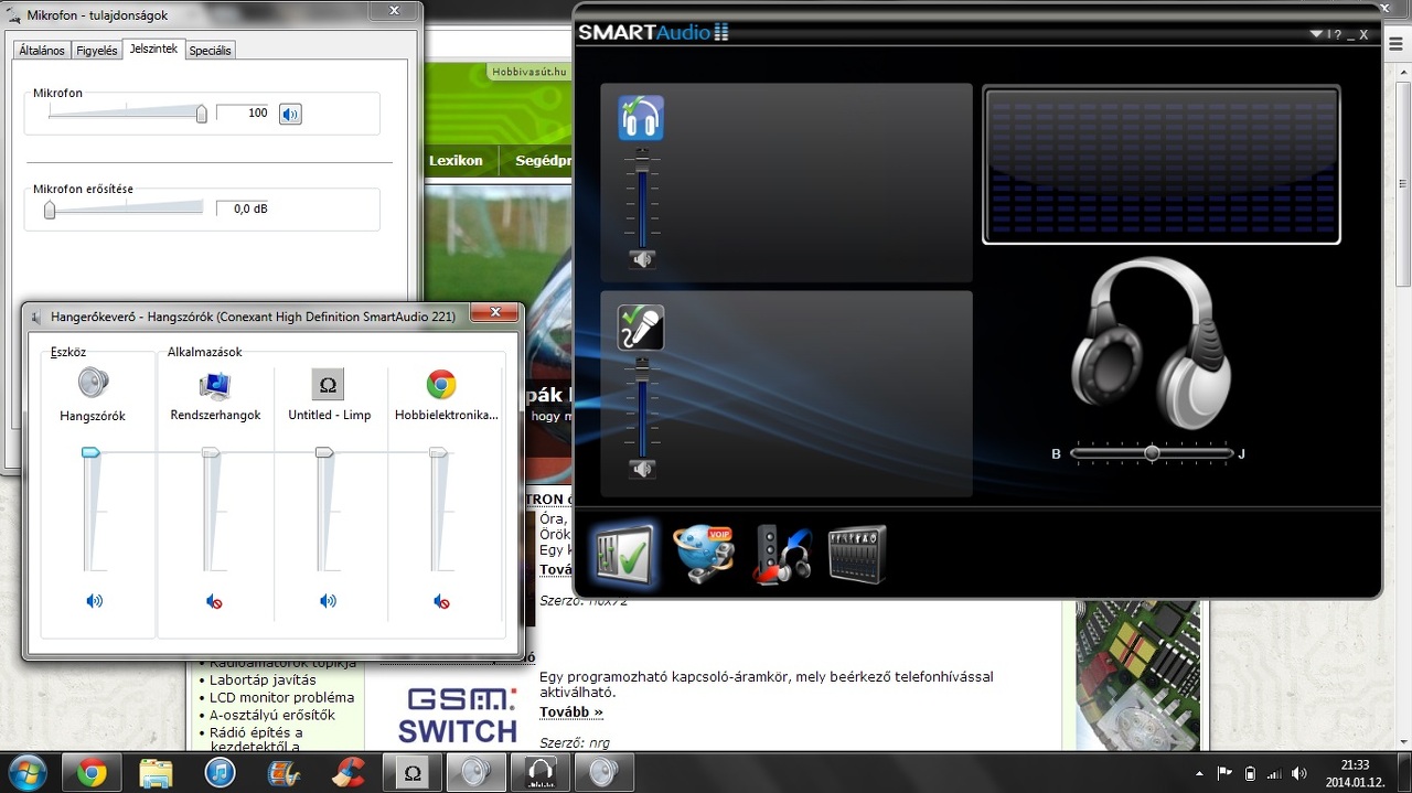 Hát igazából laptopom van (Lenovo G550) amin csak egy hangkimenet és egy univerzális line/mikrofon bemenet van. Jelenleg 0dB-re van állítva a bemenet erősítése, így elvileg line bemenetként működik. A mérőkábel elvileg jó, többször átmértem multiméterrel. A kapcsoló egy kétáramkörös tolókapcsoló.