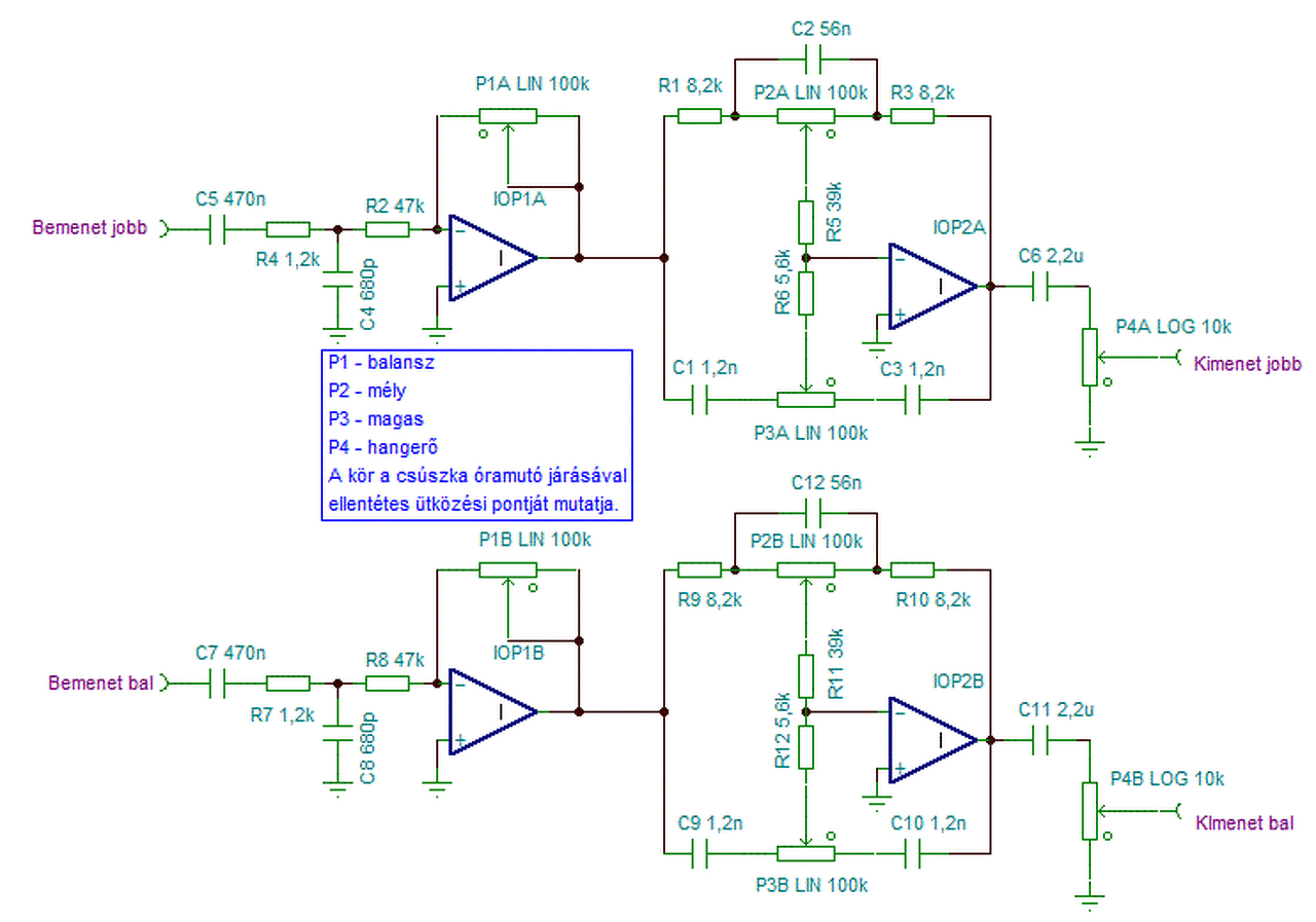 A hangszín szabályzót kis impedanciával kell meghajtani, és nagy impedanciával terhelni. Ezért van a rajzon a követő fokozat. A hangszín szabályzó alapesetben lineáris állásban annyit kell csillapítson, amekkora kiemelést szeretnél elérni. Ez azt is jelenti, hogy a hangszínszabályzót az áramkör azon a részén kell alkalmazni, ahol a lehető legnagyobb szint van, mert ebből jön le az alapcsillapítás, ami a jel/zaj szintet rontja. Ebből következik, hogy a hangerő szabályzót a hangszínszabályzó kimenetén, pontosabban a követő erősítő kimenetén kell alkalmazni.