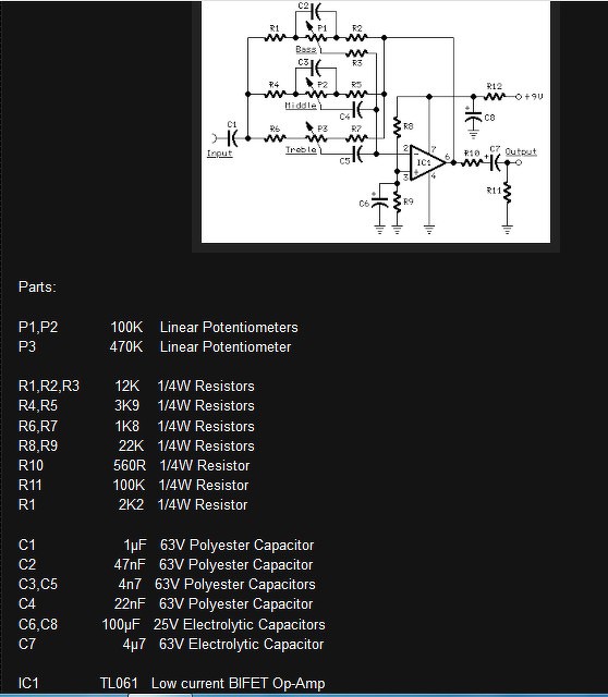Szia! Ugyan azt a visszacsatoló hálózatot alkalmazhatod itt is , amit a 3 band tone control circuit keresésre kidob a gugli. A kiszemelt áramköröd inkább szemléltető eszköznek való, mintsem gyakorlati használatra. Gyári keverők kapcsolási rajzaiban találsz kivitelezésre alkalmas példákat.