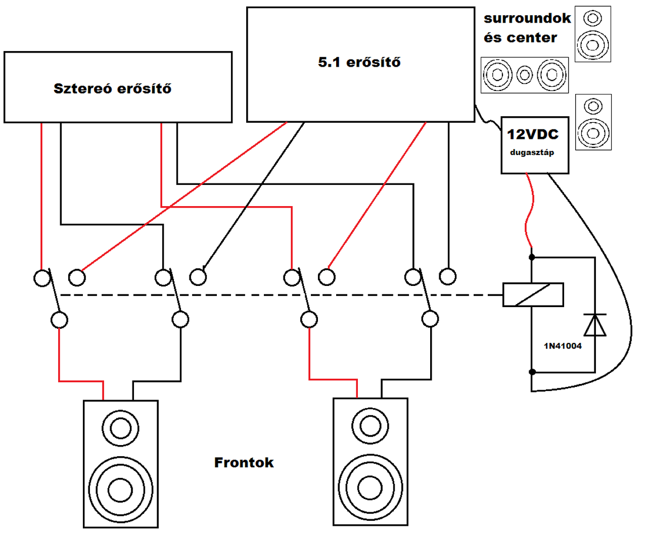A két front hangdoboz 2 vezetéke, az 4 vezeték. Mindkét szálát érdemes kapcsolni. A házimozi erősítőn szokott lenni kapcsolt 230V kimenet. Arról hajtasz egy 12V adaptert, be egy dobozba. Abban van a relé(k) és belemegy a 2 front hangdoboz 4 vezetéke és az erősítők ezen kimenetei, szintén 4-4 vezeték. Ha megy az 5.1, behúz a relé, ilyenkor megy arról a 2 front (meg persze a plusz hangszórók fixen), amikor kikapcsol, elejt, és a sztereóról megy a 2 front. Ne kavard össze a vezetékeket, mert kiszállhat az éltető füst az erősítőkből! A hozzászólás módosítva: Dec 12, 2016