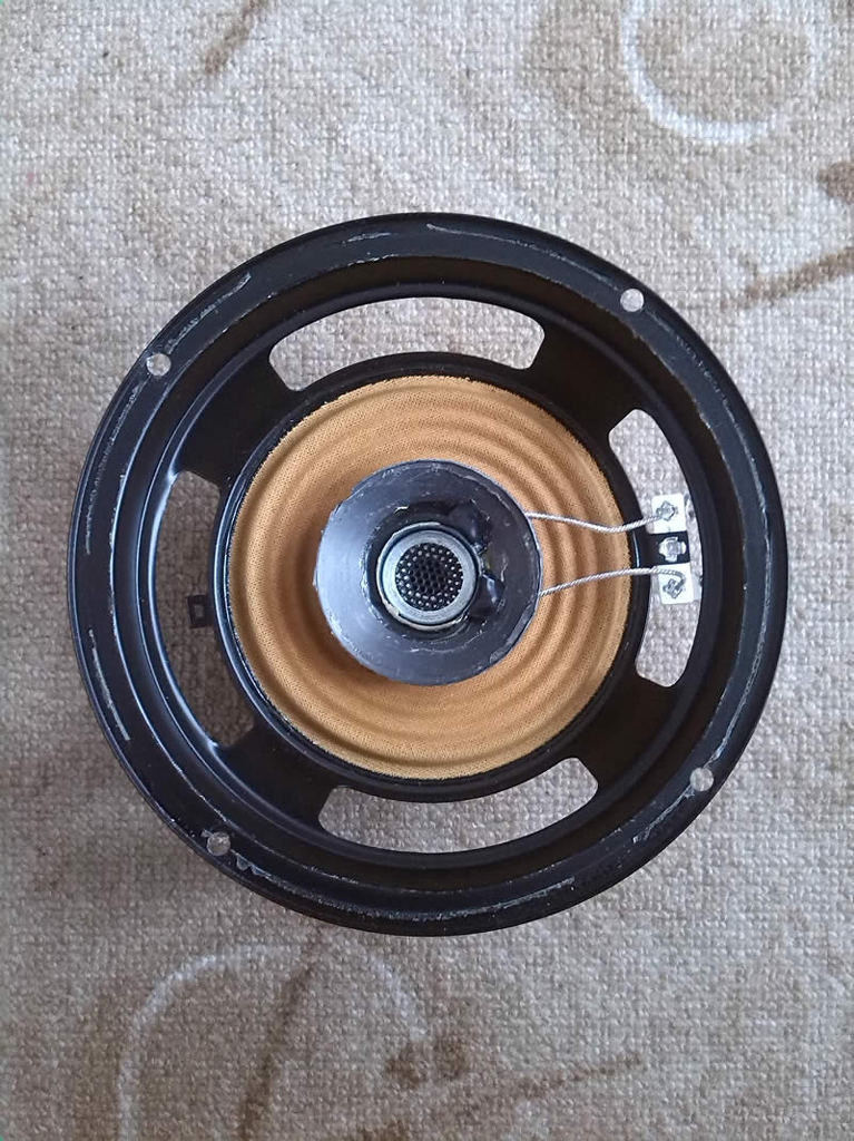 Tehát, akkor. Kivettem a 16 centis hangszóró membránját, kibéleltem a tekercs légrését papírral, pillét letakartam a forgácsok miatt, levágtam a keretet. Kivágtam az új keretet, összeszenvedtem a mágnessel, pop szegeccsel rögzítettem. Lehetne merevebb is, de a csatorna lemez éppen megfelelően merev. A membránnal kb. annyit szöszmötöltem, mint a vassal. Egyszerű rajzlap vastagságú papír, a színe meg azért olyan, mert az volt. A tekercs és a mágnes közé papírt tettem így megmaradt a légrés. A membránt ráragasztottam a szélre, majd ezeket a tekercsre. Amikor megszáradt összeragasztottam a keretet a széllel, majd kivettem a papírt a légrésből, így szerintem központos maradt. Betettem a ládába, és döbbenetesen hibátlan. Halkabb, meg kevesebb a magasa, de ezek két mozdulattal kompenzálhatók az erősítőn. Nincs rezonálás, surlódás. Nem tudok róla többet írni, mert jó. Persze nem olyan, mint egy eredeti 25 centis gitárhagszóró, de teljesen használható, Shadows-os visító hangot nem lehet tőle várni, de blue-rock-ot simán hozza. Nem is veszem ki a ládából egy darabig.