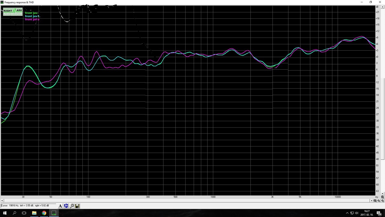 Spexcel oldalán olvasható mérés bemutató után én is próbálkozom valamilyen méréseket elkövetni, az ott leírtakat alkalmazni. Rubicon rp 26 házimozi hangfal szettemen. A pontosságról vannak kétségeim, de a cél inkább a nagy disznóságok kiszedése a hangképből ha lehet. Hallgatva is feltűnt, hogy a mély nem túl acélos benne, de ez nem gond, mert aktív subra van bízva annak a megszólaltatása. A magas viszont mindig soknak éreztem ezt a mérés mutatja is, ami viszont drasztikusabb az 3khz-en az a beszakadás. Magasak azonos polaritással vannak bekötve. Ezen lehet változtatni? Esetleg fordított polaritással? Magas előtt 2 rendű mély előtt első rendű szűrés. De ezekkel még nem annyira vészesek. A center és a hátterek annál inkább, fülre is furcsán szólnak. A magas előtt kb 5-6 ohmos ellenállás és 2.2µF kondi. Ezekkel kellene főleg kezdeni valamit.