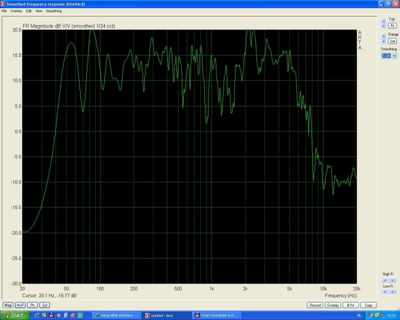 A "Smoothing"-ot állítsd 1/24-re és ha szobában mérsz, a mikrofon mögé tegyél 20-30 cm-re ívesre hajlított piramis szivacs táblát. Mivel esetedben csak az átviteli görbe a lényeges, így csak annyi hangerőt kell adni rá a méréskor, hogy ne vezérelje túl a mikrofont. A mikit kb 1m-re rakd a hangsugárzó elé. A környezeti zajszint és a mérés szintje között jó ha van kb 50 dB különbség, tehát csendes körülmények között mérj. Ha még a későbbiekben is fogsz ilyesmivel foglalkozni, akkor javaslom, készíts egy mérőmikrofont.