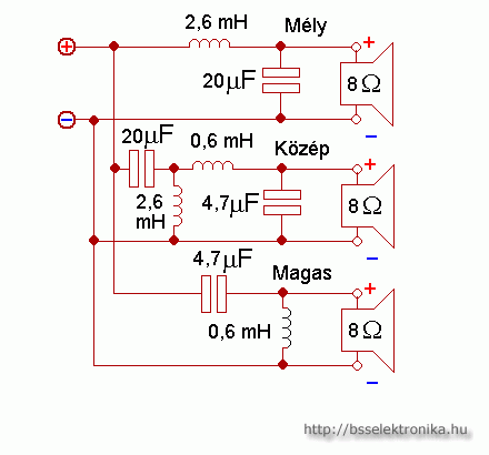Sziasztok.Egy olyan problémám lenne,hogy szeretnék késziteni egy 3 utas passziv hangváltót 8ohm 12db/oktáv meredekségűt 400/2600Hz keresztezési frekvenciával.Ehhez kellene nekem kapcsolási rajz.Van egy kapcsolási rajzom.de ezen a keresztezési frekvencia 700/3500Hz.a kérdésem az lenne hogy miket kell megváltoztatnom hogy olyan keresztezési frekvenciám legyen ami nekem kell?A hangszórók amiket kötni szeretnék rá a következők.