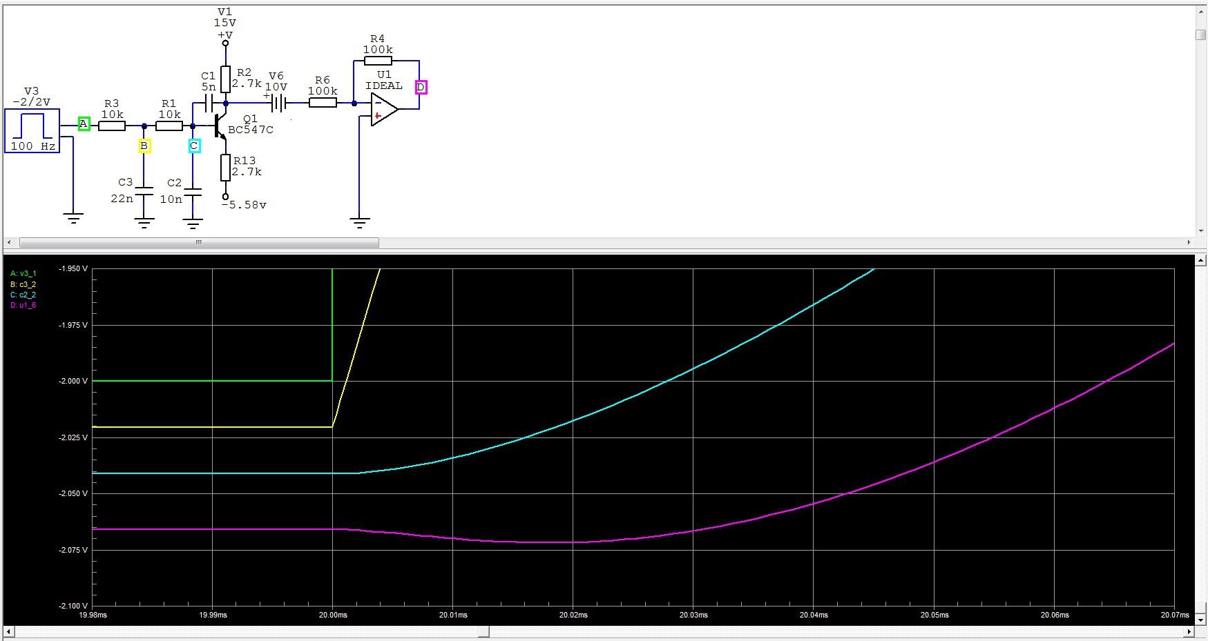 Itt van amire gondoltam. A kimeneten az opampos invertáló erősítő csak azért van, hogy a görbék egymáshoz képest fázisban legyenek. Látszik, hogy az utolsó görbe először ellentétes irányban akar indulni.