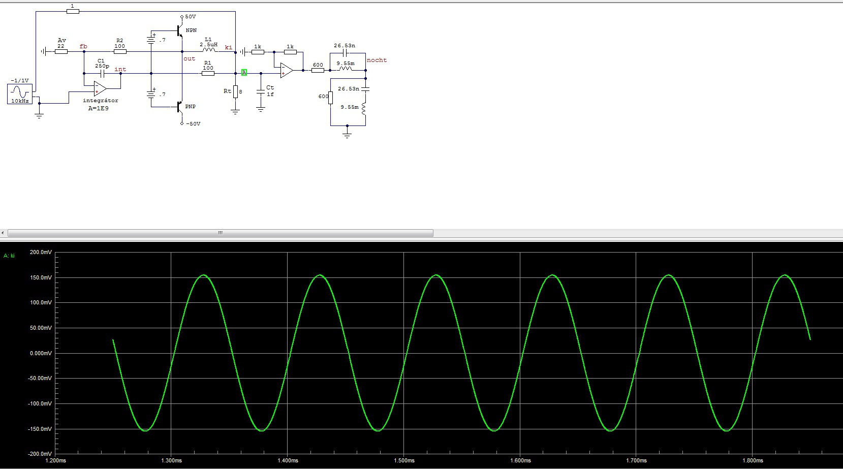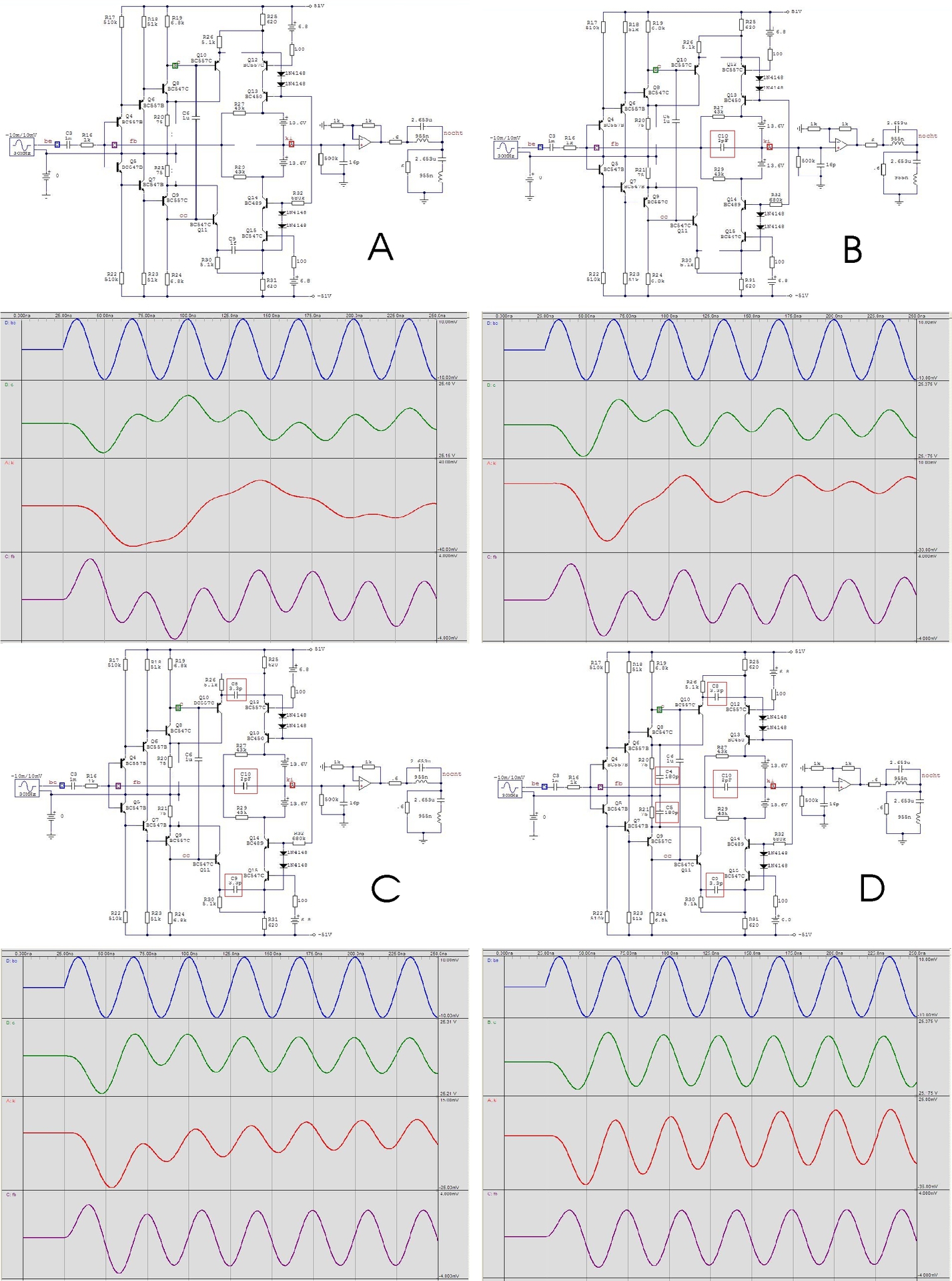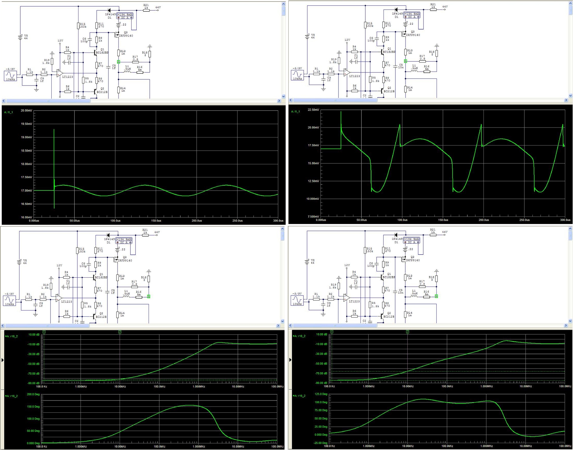Amikor éppen azt nézegettem miként lehet minimalizálni a hibajel-erősítő áramát (szerintem nevezhetjük így az integrátort a továbbiakban) és gondoltam jól megkínzom kapacitív terheléssel, hogy erre mit lép... akkor figyeltem fel rá, hogy csal a Bode. Persze ez már nem az első eset, hogy ezt látom és emlegetem is néha, hogy nagyon "figyelni kell a Bode kezét" mert néha csal. Ezt már a PWM erősítőknél is felvetette katt (anno), hogy nem lehet a PWM-ek Bode-ját felrajzolni. Miért nem lehet? Ezért nem lehet, amit most látunk. - A csomóponti feszültségek szinuszai azt mutatják, hogy kialakult egy feszültségrezonancia kimeneten. A főerősítő kimenetén 5.6V van, de a hangszóró kimeneten közel 40V. - Alatta, a Bode meg azt mutatja, hogy az integrátor kimenetén 150V-os csúcsfeszültség van. Ez nyilván nem lehetséges mert a végtranzisztorok bázisa és emittere között nem lehet Ube-nél nagyobb fesz. különbség. Akkor most hazudik a Bode, vagy nem hazudik? Nyitva hagyom kicsit ezt a kérdést... amíg tovább rajzolok.