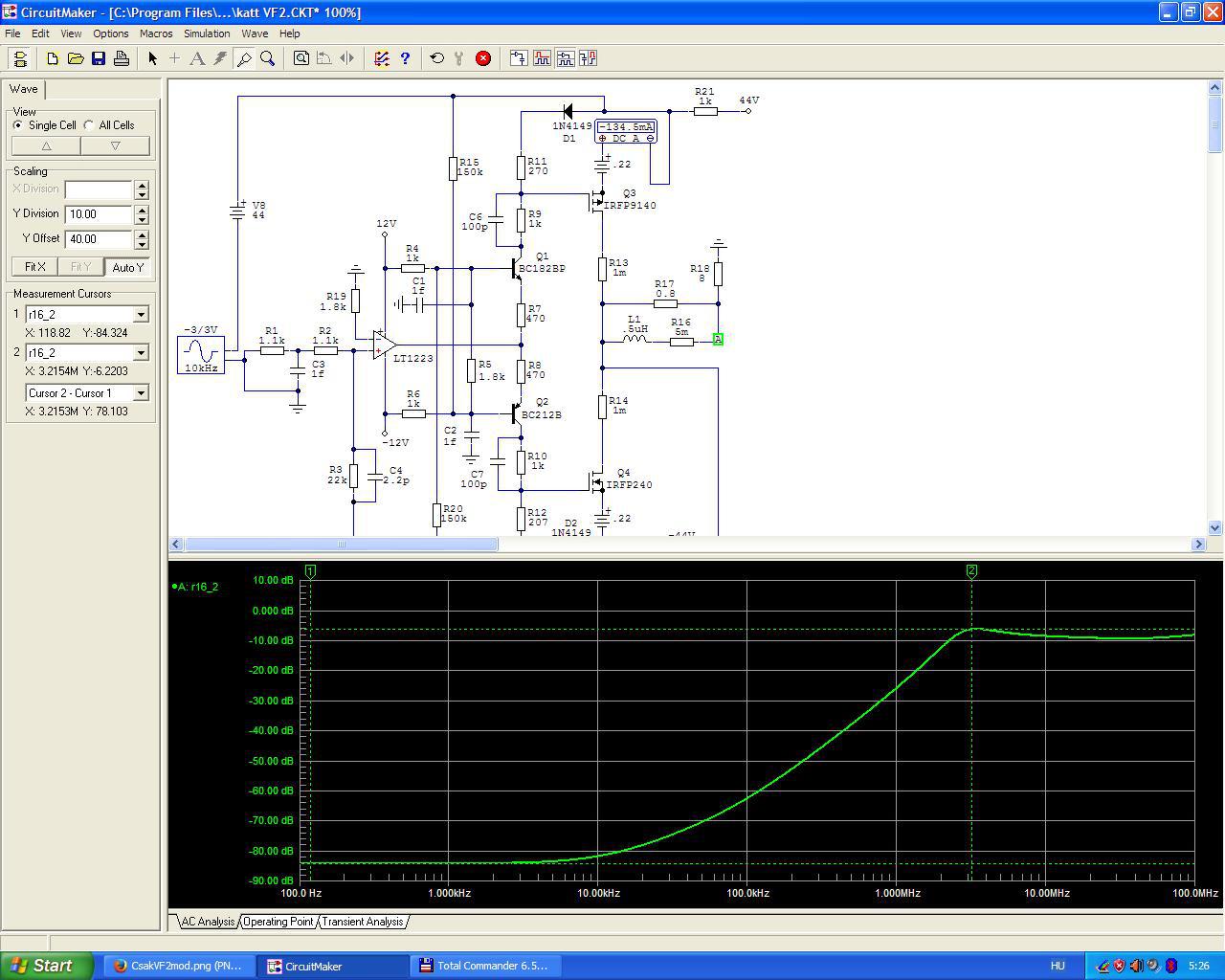 Idézet: „A VF2-nél az a probléma, hogy az adott FET gate-et az hozzátartozó földelt bázisú feltölti rendesen, de azt a gate töltést mi fogja kisütni?” Szerintem R11 fogja kisütni a gate töltést. C5-re ugyanazt tudom kérdezni, mint te kérdezted highand-tól... minek az oda? Lerontja a tápelnyomást, segít összenyitni a végfeteket. R15, R20-nak továbbra sem tudom mi a szerepe. R9 egy újabb pólust visz be, C6 semlegesíti. ??? Idézet: „Mi az a komoly tüske és honnan jön? Amplitudó, idő?” A tápsínben keletkeznek zavarjelek. Ugyanúgy, mint a PWM-nél. De itt szinte egy az egyben kijutnak a kimenetre... és egyéb gondokat is okoznak.