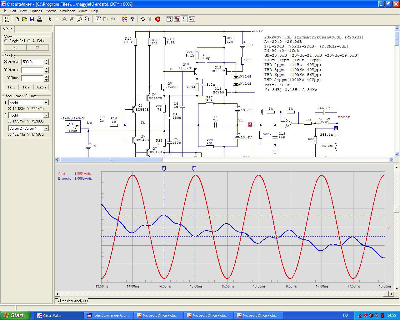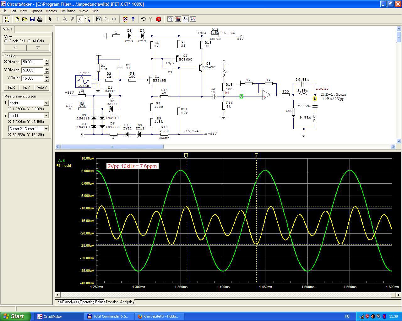 Az R15, R20 által kevésbé fog függeni a nyugalmi áram, ha változik a tápfeszültség, hiszen ezeken keresztül huzogatja a bázisok potenciálját. Itt, ha jól emlékszem nem teljesen jól van beállítva, lehet jobb is. Miután a földelt bázisúak szinteltolók, de ugye nem arról van szó, hogy a teljes 40 V-nyi amplitudót kell biztosítani, hanem csak néhány voltot a tápsinek közelében. Ebből meg az jön, hogy túl sok DC feszültség marad a tranyókon, de áram az van ( a nyugalmi áram miatt ) ami felesleges és jó nagy disszipációt eredményez. Ezek a soros ellenállások ennek a disszipációnak egy részét veszik magukra. Néha esetleg lehet gerjedés, ezért kellenek a 33...220pF-os kondik. Az eredeti kapcsolásban a földelt bázisúak bázisa a 12V-on van. Ezzel csak az a baj, hogy 14...18Vp-p kimeneti jelet kell adnia az opampnak. Ez már slew-rate problémákat okoz. Ezért lett kisebb feszültségre állítva a földelt bázisúak bázisa. Én nem hiszem, hogy a tápsinen lennének tüskék. D osztályban biztos, de itt mitől? " De itt szinte egy az egyben kijutnak a kimenetre... és egyéb gondokat is okoznak." Egy-az egyben? Még 10 kHz-en is 66dB a tápelnyomás... egyébként, ez HEC-hez készült és az kijavítja , kivéve a tüskéket, mert ha azt is ki tudná javítani akkor keresztezési torzítás se lenne.