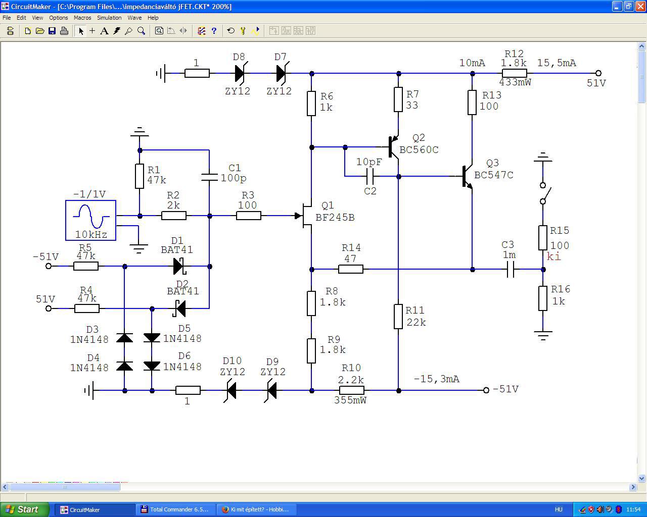A diódán nem visszafelé folyik az áram, azon egy modulációs áram folyik. A gyakorlatban sosem lesz nulla R11 árama, ezt hidd el. Felőlem akár benne is lehet C5. Mivel úgysem fogod megépíteni, a fetek sem fognak tönkremenni.