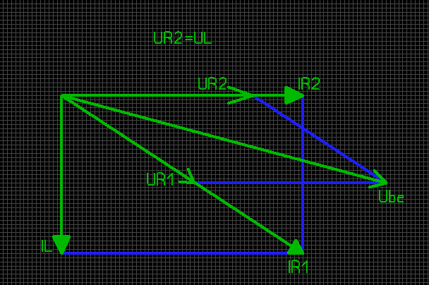 belülről kell indulni, tehát a párhuzamos RL ről. Ezen a feszültség a közös (UL=UR2), lerajzolod valamilyen irányba, tökmindegy. Erre a feszvektorra merőleges -90° al az IL, és egyirányú vele az IR2. Ezek eredője adja a bemenő áramot IR1 (UR1 egyirányú IR1 el). Ube vektor pedig az UL és UR1 eredője. Eredőket grafikusan palalelogramma módszerrel kiszerkeszted. forgásirányt nem rejzoltam fel: balos (jobbmenetes csavas kifelé tekerve) ..igen SPL5 el rajzoltam..