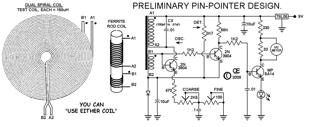 A másik, amikor a tárgy mélyen van, és van már egy gödör. Egy kis gödörben nagyon nem lehet megtalálni, pontosan hol is a cél tárgy aztán az ember végül már kénytelen egy hatalmas tárnát készíteni :peace: Ilyenkor jó lenne egy olyan pinpointer, amivel a gödörben pontosan meg lehet határozni a helyet , na erre nem feltétlenül elég, ha pici a céltárgy. A két kapcsolásban az oszcillátor ugyanaz, a jelfeldolgozásban van különbség, de ez nem hiszem, hogy számottevő az eredményt tekintve.
