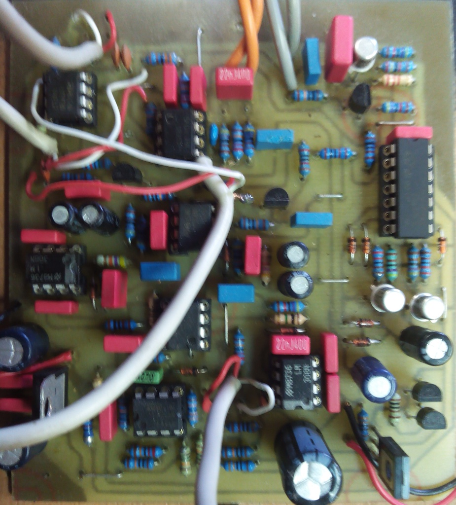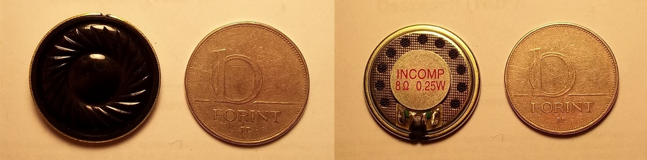 A baloldali TV hangszóró 5 centi széles, így nem fért be az 5 centi külső magasságú dobozba, pedig hatalmas hangja van, és olcsó is volt (150Ft). Ezért a mellette lévő kis vacak lett beépítve ami jóval halkabb. A problémát úgy orvosoltam, hogy a nekem inkább tetsző pár száz Hz-es hangfrekit feljebb vittem néhány kHz-re, ott már a pici is elfogadhatóan szól, meg ugye arra a frekire a fül is érzékenyebb. Így elég a potin éppen beállított hangerő, meg a súly is kevesebb, cserébe a vinnyogást kell hallgatni a kellemesebb, mélyebb hang helyett. Mondjuk azért ha letekerem a trimmerrel a hangfrekit akkor sem rossz, csak közel koppra kell tekerni a hangerőt.
