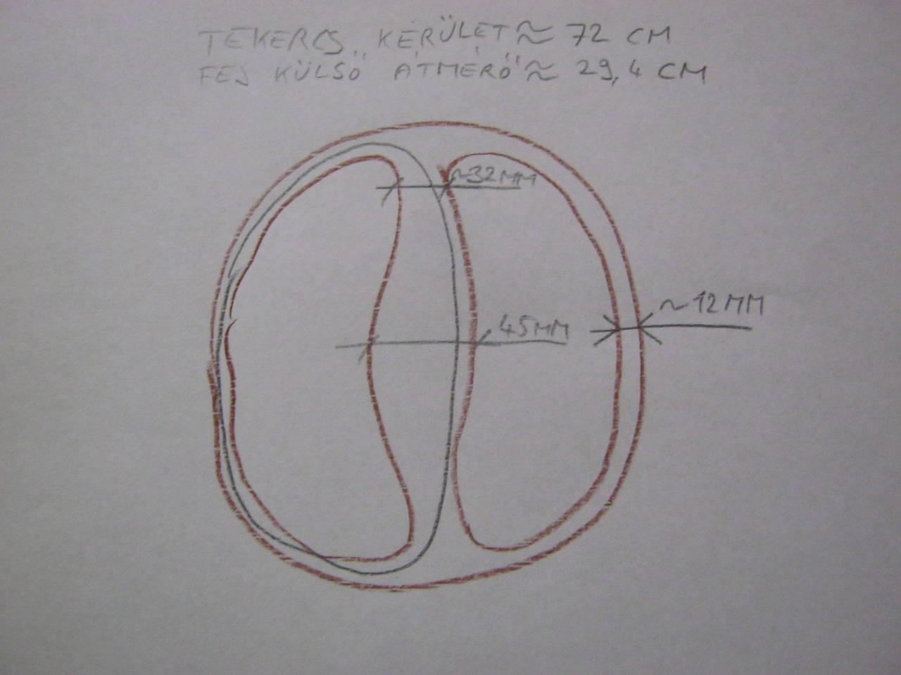 Először is a tekercsek. Az adó 98, a vevő 107 menet a netes leírások szerint. ha én csinálnám a sajátomhoz, akkor a vevőt 115-re tekerném az én sablonomra. A vevőt 0.2, az adót 0.3 mm átmérőjű zsinórral. Ha van. De ha csak 0.25 lenne, akkor azzal tekerném mindkettőt. A tekerő sablon mérete ugye relatív, így én csak a saját adataimat tudom példa képen felhozni. A fej méretei a képen láthatóak. Ez alapján kiszerkeszthető a tekerő sablon. Ami lehet akár egy falapra szerkesztett rajz, amit körbepüfölsz szögekkel, és rátekered a tekercset. vagy két mintára fűrészelt bútorlap, amibe hornyot marsz-maratsz felsőmaróval, bevagdalod, és arra tekersz. A tekercset úgy szoktam tekerni, hogy a tekercselő huzalra ráforrasztok egy szigetelt bekötő huzalt. A szigetelést zsugorcsövezem. Ez azért hasznos, mert ha a tekercsből a zománc szigetelésű huzalt vezeted ki, akkor arról néhány mozdítás után tőben lepattoghat a szigetelés, és készen van a menetzárlat. de ha forrasztasz rá kb 20 cm szigetelt vezetéket és annak egy részét betekered a tekercsbe, akkor onnan már a műanyag szigetelésű vezeték jön ki, amiről tőben nem fog lepattogni a szigetelés. Másrészt a később rákerülő árnyékolással sem fog összeveszni. Tehát megtekered a tekercset a sablonra. Persze mindkét huzalvég szigetelt vezetékkel jön ki a tekercsből. ezután impregnálni kell. Az impregnáló anyagnál is megoszolhatnak a vélemények. Én általában valamiféle víz bázisú lakkot, vagy lazúr festéket használok. Ha ilyennel impregnálom, akkor a későbbiekben is rugalmas marad a tekercs, és nem bántja a tekercselő huzal szigetelését. A nitró lakk például bánthatja a lakkozott huzalt, és ha megszáradt, akkor a tekercs későbbi hajlítgatásánál lepattoghat, mert rideg a bevonata. Tehát a megtekert tekercset a sablonon be kell lakkozni, és ezután erősebb cérnával körbe kell bandázsolni, hogy a tekercs menetei lehetőleg össze szoruljanak. Ha szorosan össze lett bandázsolva, akkor le lehet venni a sablonról. Víz alapú impregnálásnál 2 napig meleg helyen kell száradni. Fontos az, hogy teljesen kiszáradjon. Illetve érdemes megnézni szkópon a nedves tekercs jeleit. Ha a tekercs kiszáradt, akkor még kaphat 2-3 réteg lakkot, hogy a későbbi árnyékolástól frankón el legyen szigetelve. Szerintem a képek alapján neki tudsz állni a tekercs csinálásnak. A regény (vagy blog) következő részét írom a későbbiekben. Addig ez úgyis leköt, illetve fölteheted a kérdéseidet.