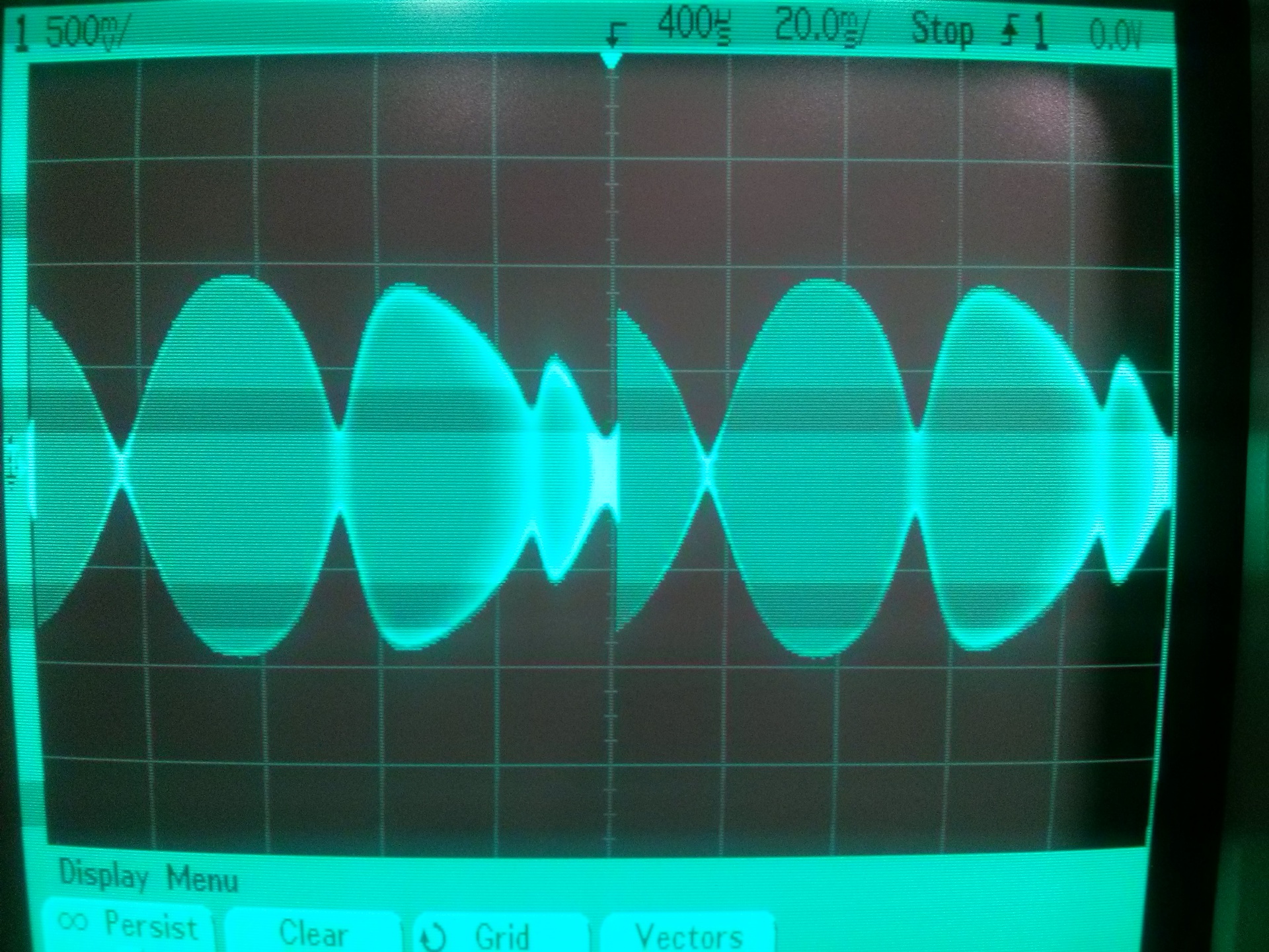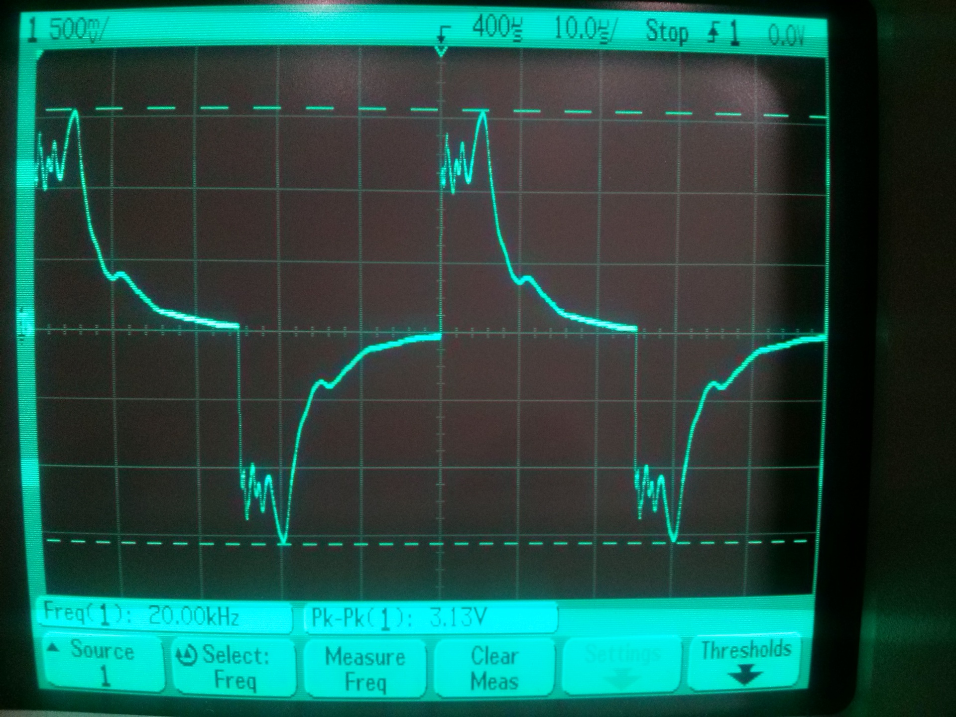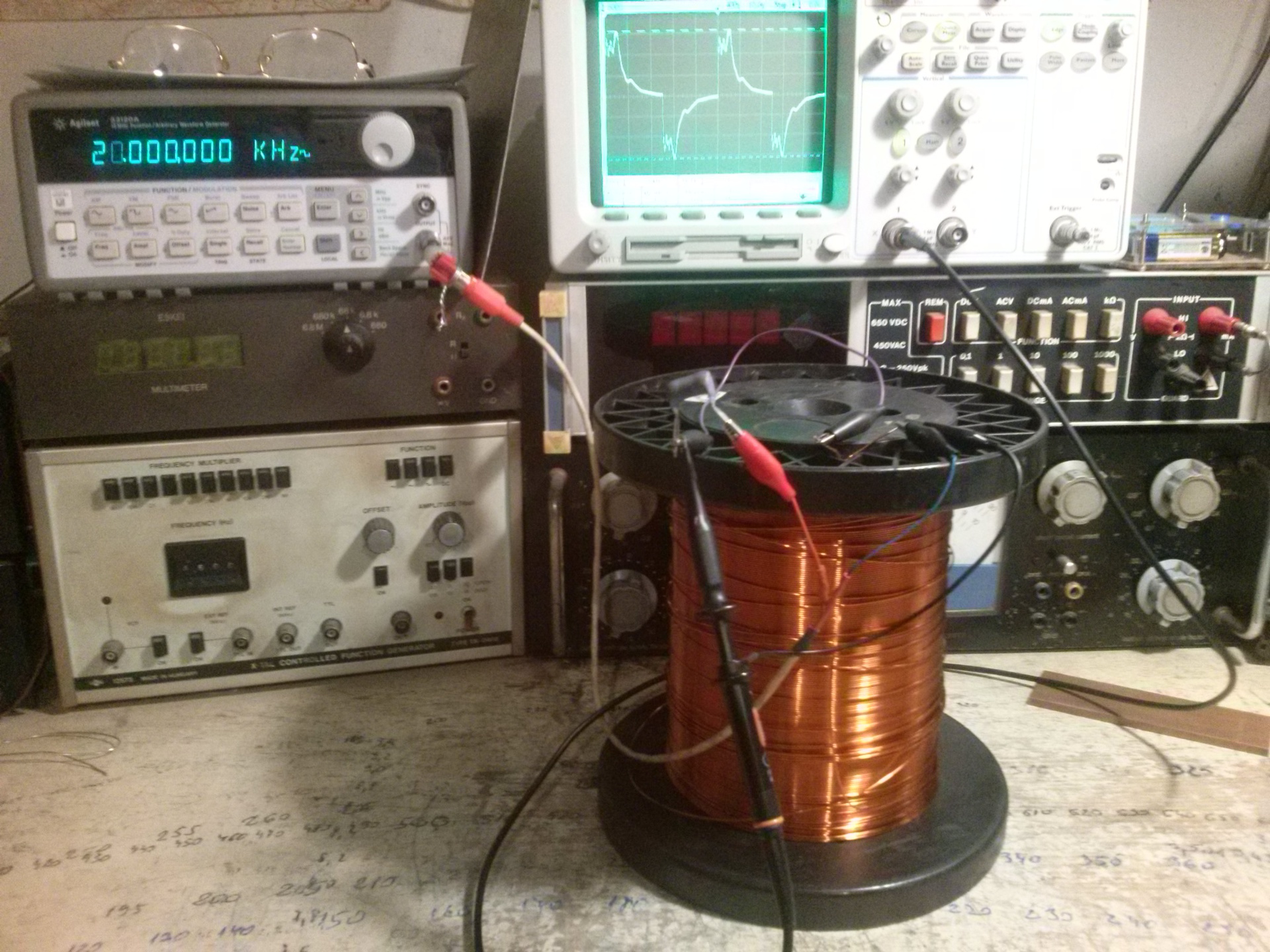 A "történet" valóban bonyolult. Nem volt hangulatom tekergetni egy "ilyen" és egy "olyan" tekercset - vagyis egy kis és egy nagy sajátkapacitásút, de találtam a polcon egy - a célnak éppen megfelelő - kuszán tekercselt "légmagos induktivitást". Nem is kellene idézőjelbe tennem, mert végül is az. Nagyjából 7 mH. Ráadtam 0.1 sec 100kHz-1MHz-es sweep-et és megnéztem az amlitúdómenetet. Aztán 20 kHz-es négyszögjelet.
