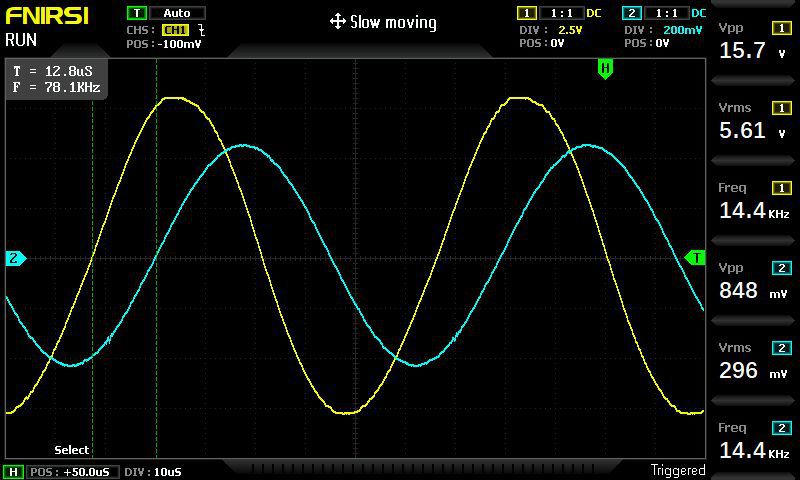 Sárga az adótekercs, kék a vevőerősítő kimenete. Ez 62° fázistolás kb. Tekercs tologatással le tudom vinni 48°-ig, ilyenkor már a vevőerősítő kimenete majd 4Vpp. De ilyenkor folyamatosan csipog, mindkét csatorna 4-6 csipp/s.