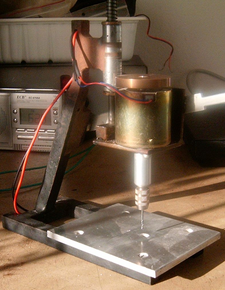 Tehát pár db kép, ahogy igértem.A motor valóban bontott video, a befogó szerkezet az "gyári" (volt 1 kis panelfúróm ,csak a motorja nem bírta) . A motor tengelyére úgy lett fel szerelve, hogy esztergáltam hozzá 1 közdarabot ( a képen is jól látszik). Nincs hozá fordulatszabályozás, felesleges, simán 12V-ról járatom. Az állvány 12-es négyzetesvas, heggesztéssel érte el a jelenlegi formáját. Ez a fúró többszöri átalakításon esett át, valami mindíg elromlott. Ja a festés hagy némi kivetni valót, de már pár éve így van
