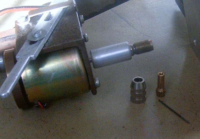 Tehát ez egy ablakmosófolyadék-szivattyú motorja... (autóból) A motor tengelyére rágyógyítottam egy popszegecset, abba pedig egy kis átmérőnöveléssel beleszorítottam a fórót, és végül egy kis anyával jól meghúztam... Egy kis adapterről megy. A fordulat jó lenne, de nem valami erős motor, tehát ha rányomom erősen, akkor lefulladgat, de még így is sokkal gyorsabb, mint kézifúróval.. Jah és most egy 0.8-as fúró van benne! Peti