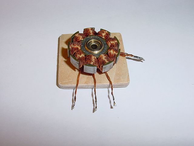Sajnos a tekercselrendezés nem látható .Habár a motyó be volt öntve, aránylag kultúráltan sikerült szétbányászni.4 láb jön ki az állórészből,mérhetően 2 tekercsről van szó .A panelen látszik, hogy a 4 kivezetésből 2 közös és testen volt, a másik 2 megy 1-1 fet-re (bts117).