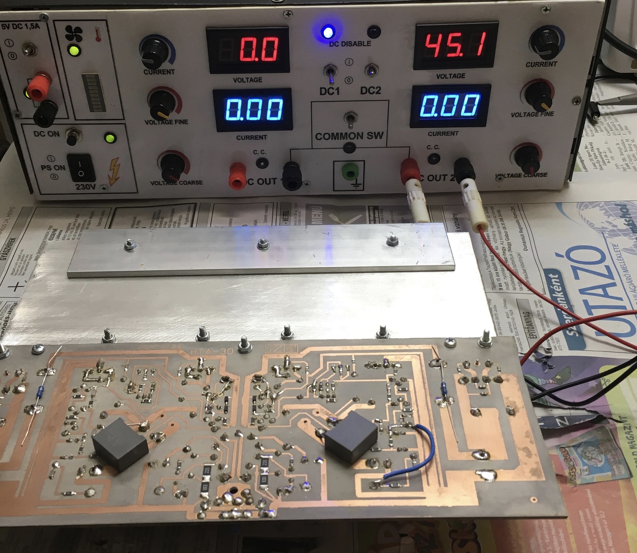 Az ELKO-kat kivettem, így nincs ami kisüsse a tranyókat, ha a 10 ohm lasan olvadna el. A labortápegységem 45V DC-t szolgáltat, 200mA-re állítottam az áramkorlátot.