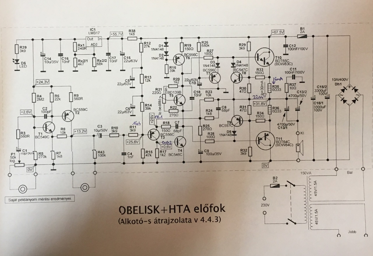 Sziasztok! Ma élesztettem a ht- mat. Öröm és üröm !!! A baloldalt próbáltam először 10 ohm rákapcsol sok a nyugalmi az ellenálláson, trimmer beállít 10,5 v-ra. Eddíg ez elvileg jó. Jobboldal ugyan ez de nem jó. A pcb-n annyit változtattam, hogy a BD 139 ne fordítva legyen a hűtőbordán, ehhez kaptam pcb rajzot is. A gond a következő -- A kimeneti kondi + oldalán 68V a - oldalon 62V. A Táp fesz 68V. A trimmerre nem reagál semmit. a BDT 65 C-68V B-68V E-68V BDT 64 C-0V B-68V E-68V . Nem füstöl semmi nem melegszik semmi. Az emitter ellenálláson sem mérek semmi feszültséget. Tanácsotokat szeretném kérni ! Lehet, hogy sok a tápfesz valamelyik kis tranyó elszállt, a diódákat megmértem azok jók. De a baloldal kibírta ugyan azt? Tanácsokat előre is köszönöm! elektrik