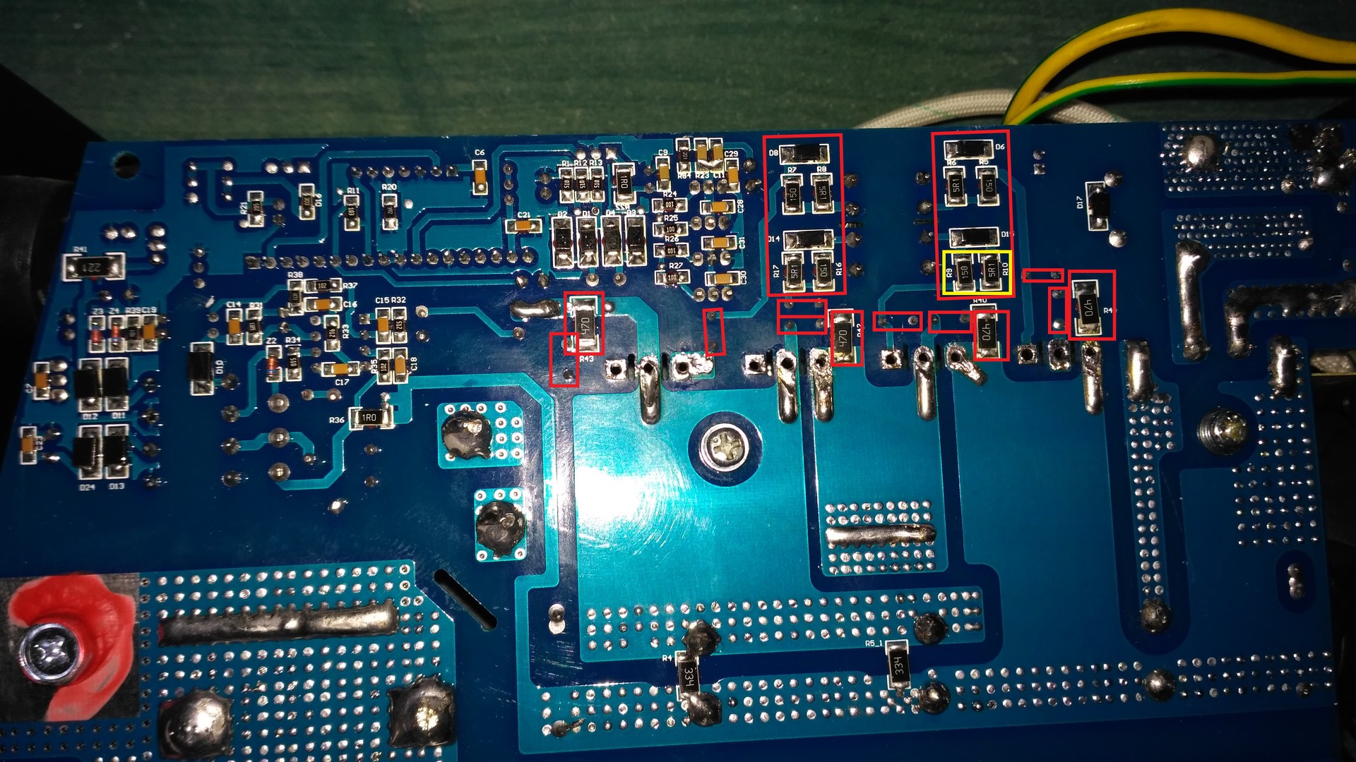 Nem jól mértem? Akkor pontosan hogy mérjem, hova tegyem a multi mérőtüskéjét? A multi mérőtüskéje a földön (kisebb elektrolit kondenzátorok negatívja, a panel bal felső részén ahol a vezérlő ic-k vannak), a másik az igbt-ek gate lábánál. Amúgy annyi történt azóta hogy a kis trafó környékén átmértem a dolgokat, persze kiforrasztva. A 3. igbt-hez tartozó résznél 2 ellenállás szakadt volt, pótoltam (egy 5,1 és 15 ohm, összekellet legóznom mert pont ilyenek nem voltak lett 5 és 14,6 ohm). Így a 3. érték feljött 11,2v-ra (váltóáram). A csatolt képek pirossal jelöltem amit kiforrasztottam, és megmértem eddig, sárgával jelöltem a szakadt ellenállásokat.