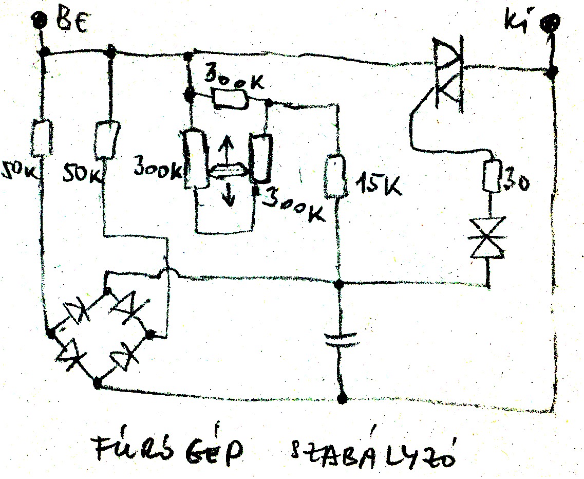 Már voltozott a dolog. 2 tirosztort elcseréltem 2 diódára. Most van 2db T171-250-es tirisztorom és 2 db D171-400-as diódám. Csak nem találtam olyan rajzot ami elnyerte vilna a tetszésemet. Most egy VISZÉK BHKV-600-as gép rajzát vadászom, mert a tirisztorok olyanban voltak. A szabályzó egy részét sikerült lerajzolnom, de sajnos használhatatlanul hiányos. Örülnék valami használható egyszerű rajznak.