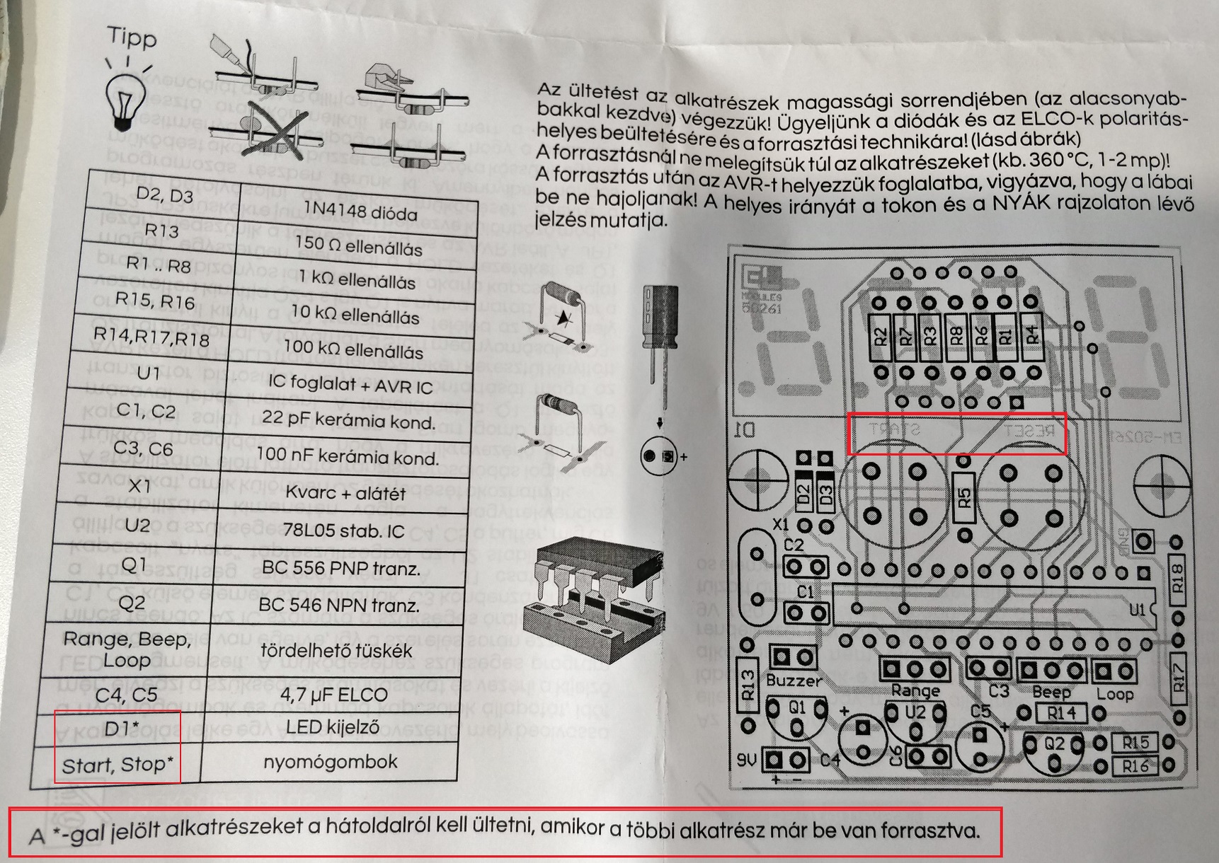 Azt észre vetted, hogy a nyomógombnak van egy lecsapott része, mely a mellékelt papíron (nyáklapi ábra) is jelölve van? Nem mindegy az orientáció! Meg persze a *-os rész, mely szerint fordítottan kell beültetni a kijelzőt és a nyomógombot is. Nálam csak a kijelző került a másik oldalra. A gombot még meg kell fordítanom... A kijelzőt 1 lábbal forrasztottam be, amikor rájöttem a baklövésre. Úgy siettem, hogy a kvarc alól is kihagytam a lemezkét (bár kilehet), és a két stabilizáló kondiját is felcseréltem előre a 100nF-al, a 22 pF helyett. De az csak azért mert később találtam meg A hozzászólás módosítva: Ápr 21, 2022