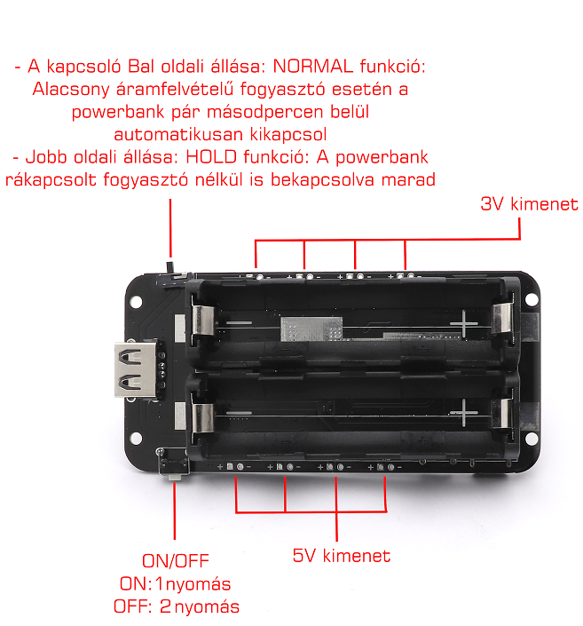 "HOLD funkció: alacsony áramfelvétel esetén meggátolja, hogy a powerbank kimenete lekapcsoljon."