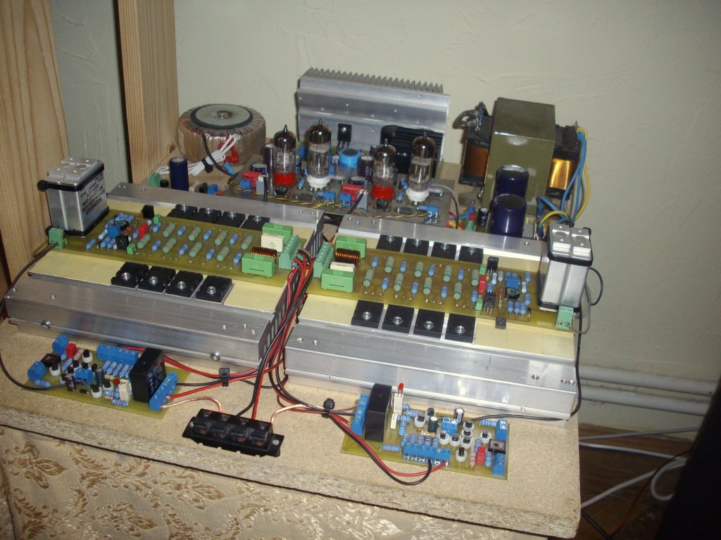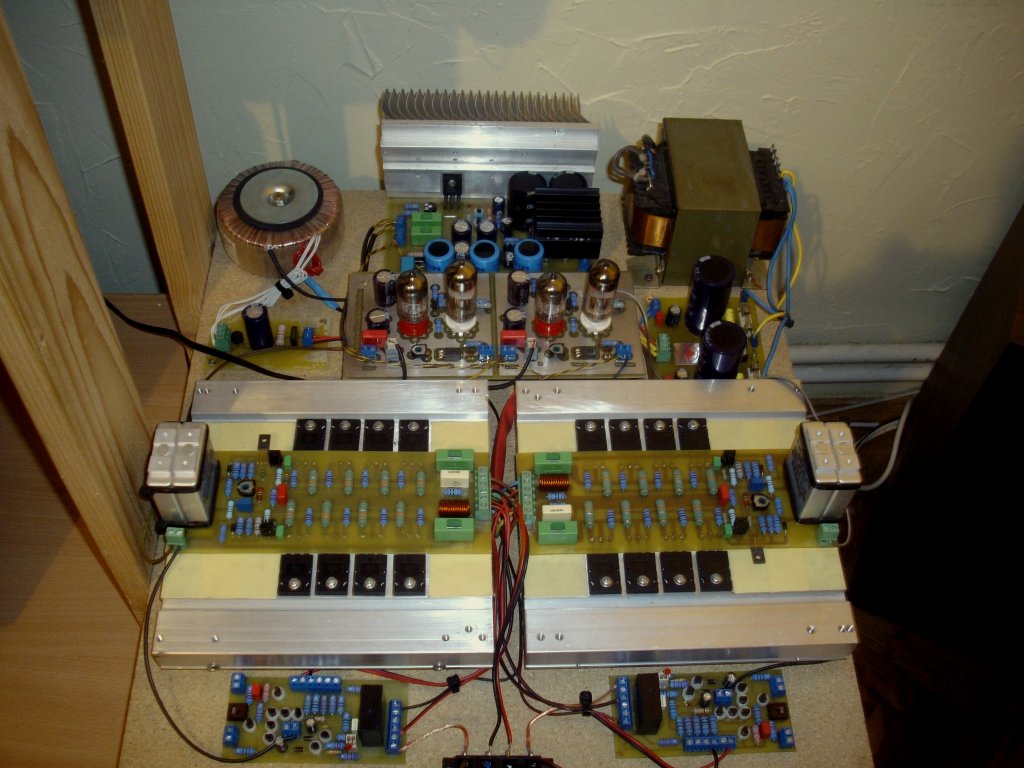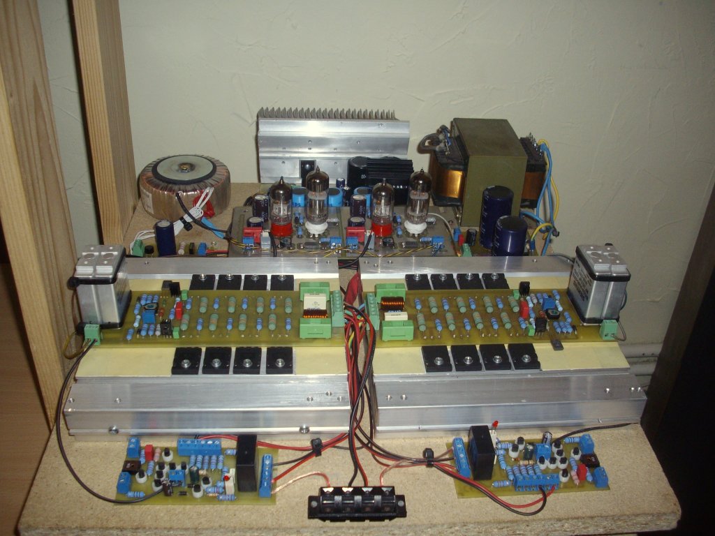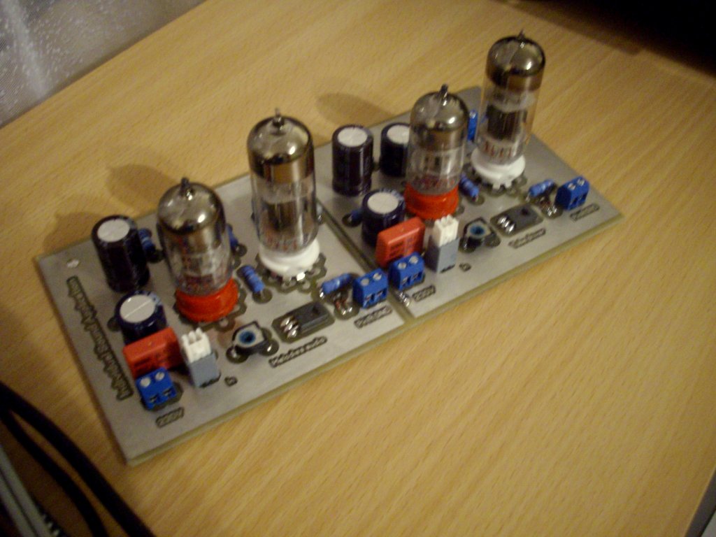 Csöves rész beállítását én a félvezetős rész leválasztásával szoktam megoldani, teljesen leválasztva a végétől.( Tápfeszt is csak a csöves fokozat kap.) Csatoló kondi kimenete 100k-val terhelve, félvezetős rész bekötése nélkül. Jelenlegi hibrid nyákján már tettem egy jumpert a beállításához. Így szerintem könnyebb beállítani, majd visszakötve .., az egész átvitelét ellenőrizni, műterhelésen, komplex terhelésen is.