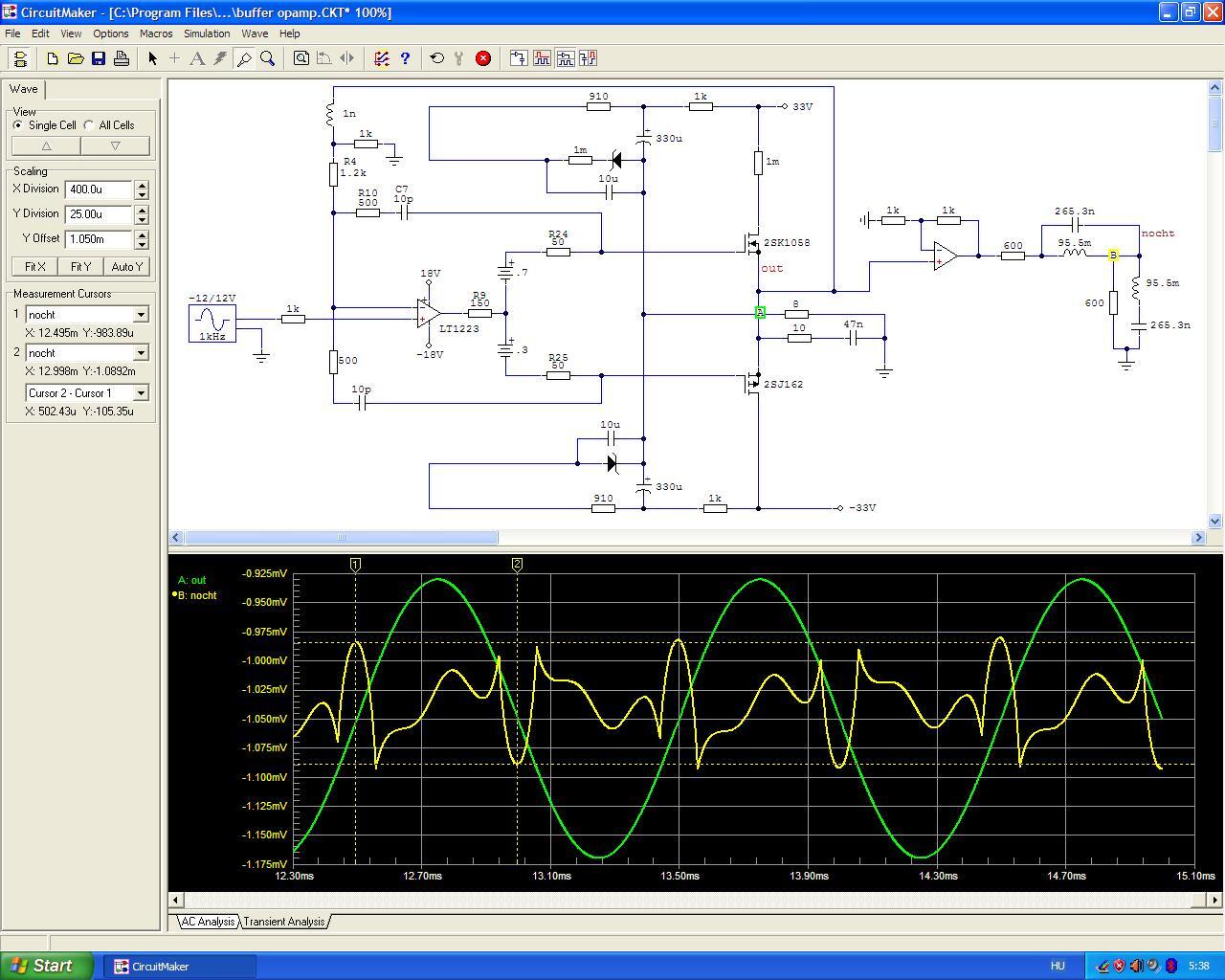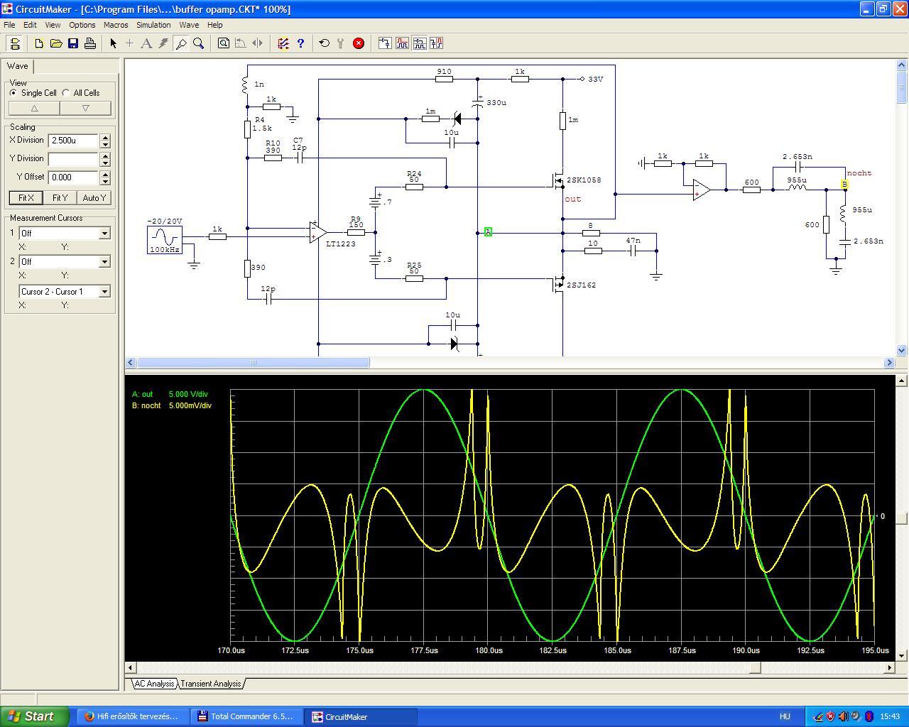 Nem értem a problémát. Itt sem lóg ki a tápfeszből a bemenet mert az LT1223-nak 10kHz-en van a domináns pólusa, az MC33078-nak meg 10Hz-en. De lehet mást nem értek (nem túl gyors a felfogásom.)